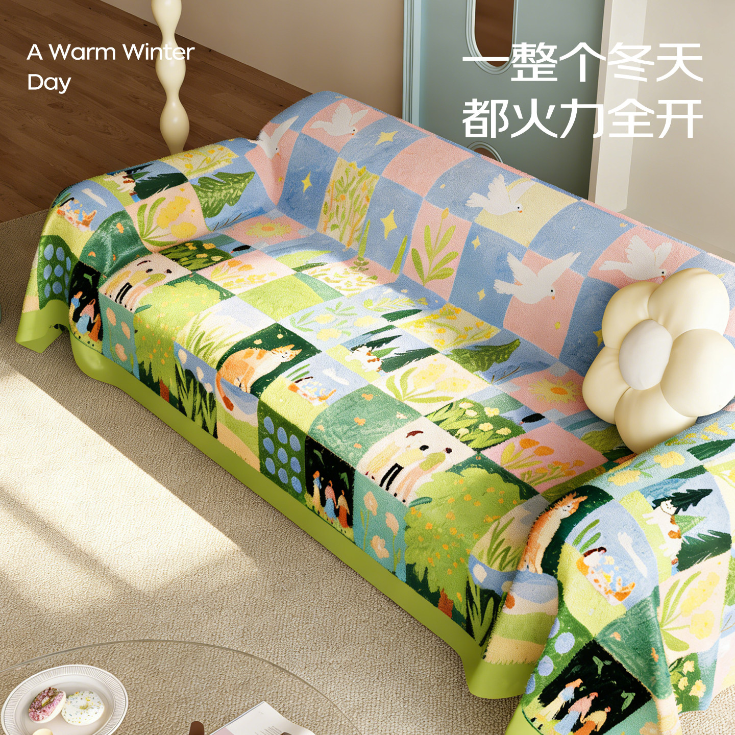 天猫卡通田园风沙发盖布毛绒沙发巾冬季多巴胺防滑沙发垫沙发套沙发毯