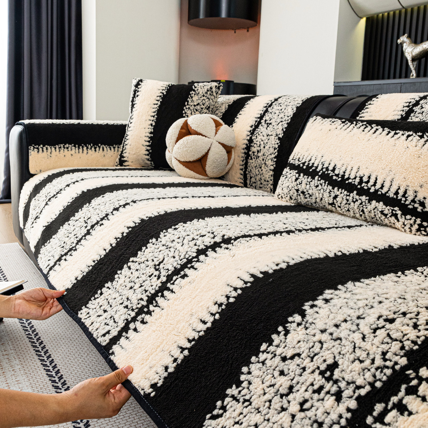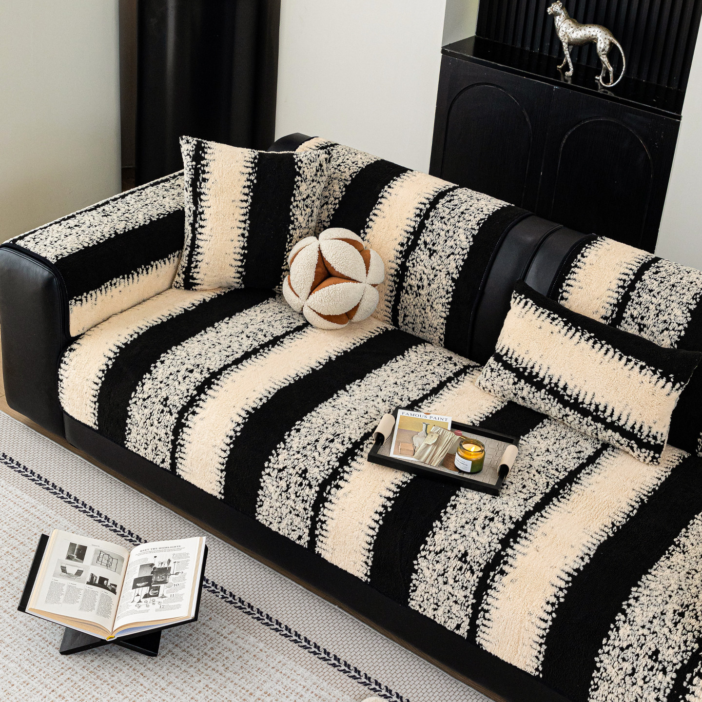 天猫简约现代条纹舒棉绒沙发垫2025新款冬季加厚皮沙发固定防滑盖布垫