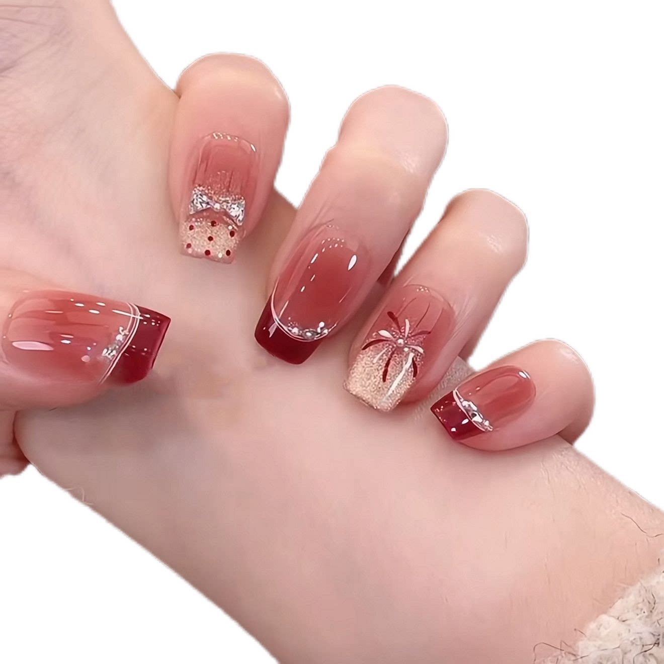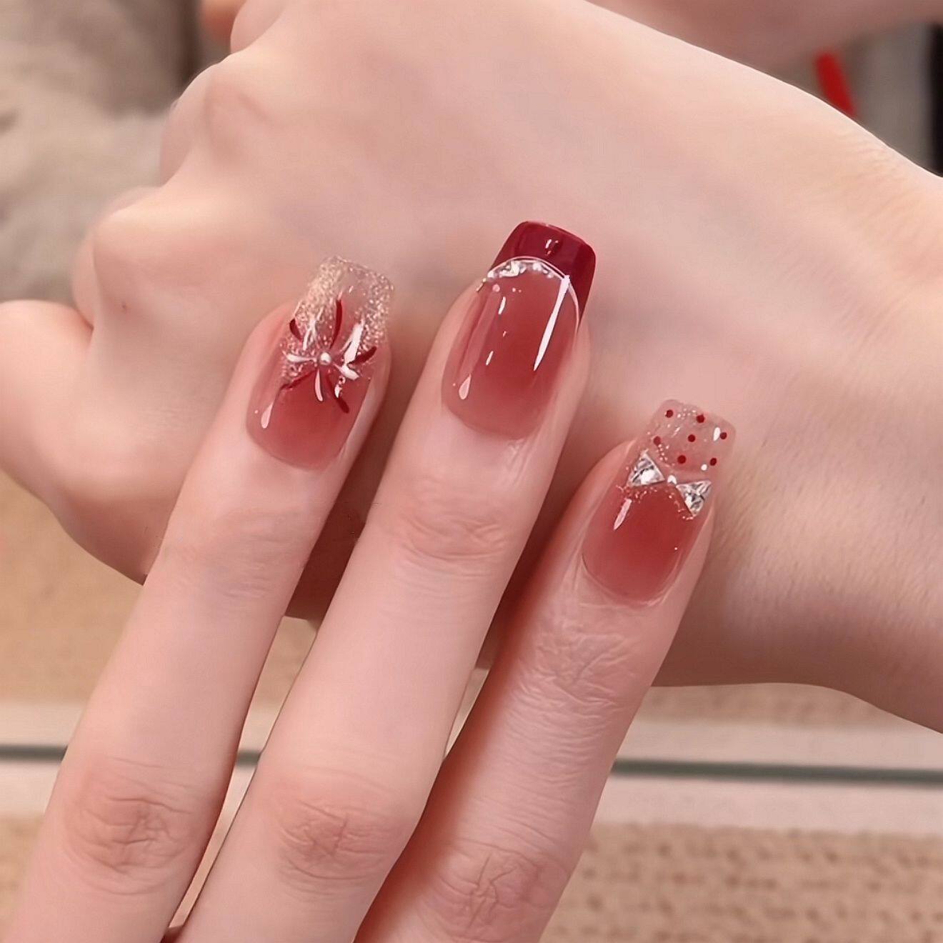 淘宝新年烟花法式酒红晕染波点蝴蝶结闪钻高级感手工穿戴美甲显白气质