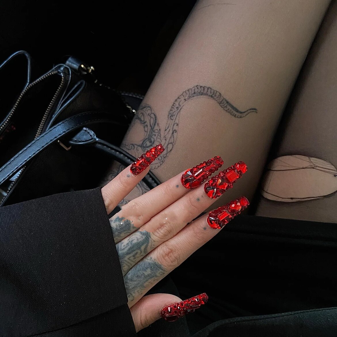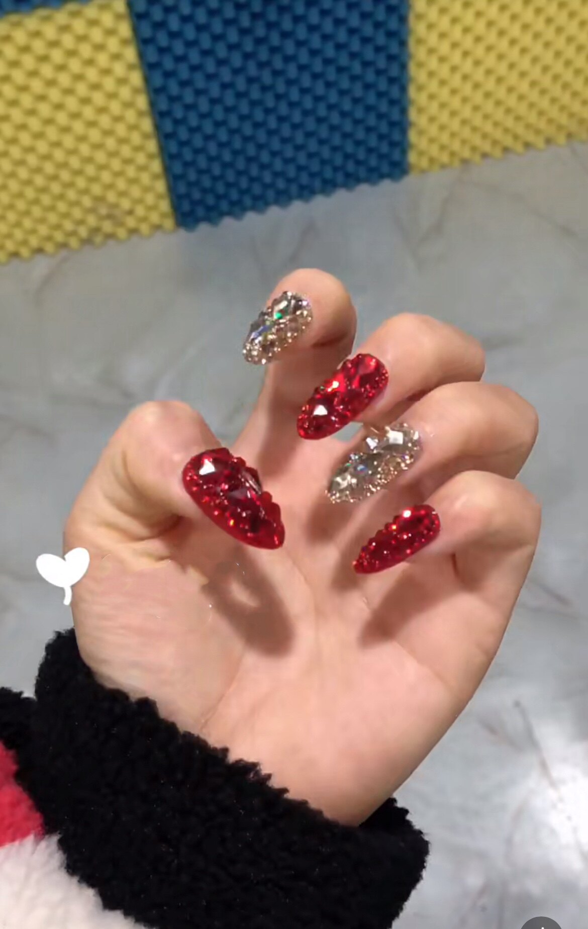 淘宝Fairy春秋新年手工穿戴甲贴片成品爆闪红色满钻实物超美长款甲片