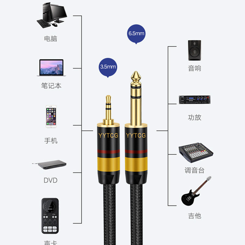 3.5转6.5大三芯音频线(公对公)是一款通用型立体声连接线,适用于手机、电脑、平板等设备与功放、音响、调音台、音箱、电子鼓、电吉他、电钢琴、电子琴等专业音频设备之间的信号传输。采用6.35mm(1/4英寸)大三芯插头与3.5mm立体声插头,支持平衡或非平衡音频信号传输,确保音质清晰、低噪音。线材采用高纯度铜导体与双层屏蔽设计,有效减少干扰,提升音频稳定性。接口镀金处理,抗氧化、耐腐蚀,延长使用寿命。广泛用于录音棚、舞台演出、家庭音响及音乐教学等场景,是音乐爱好者和专业音响师的实用音频连接解决方案。