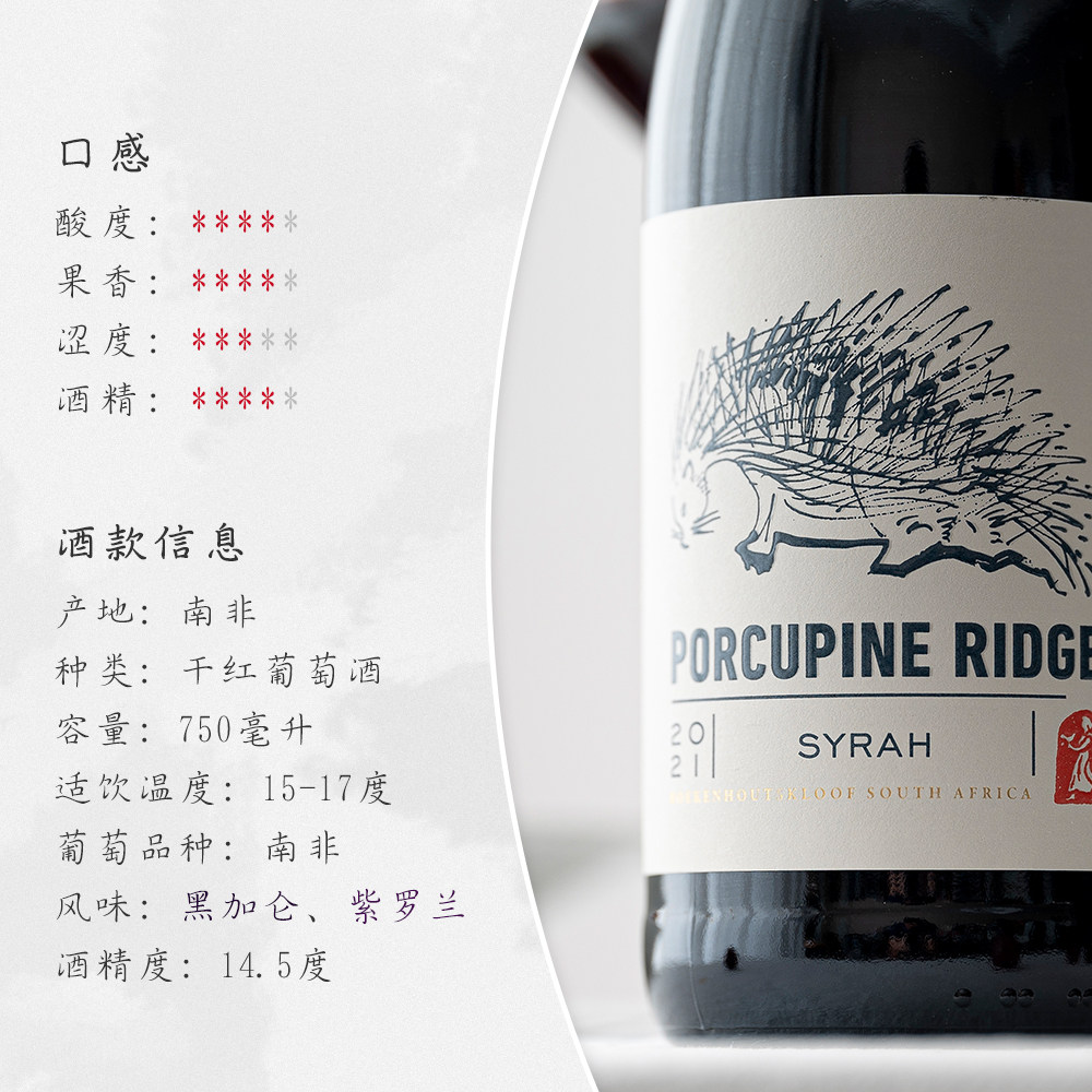 淘宝简单好喝不乏味 黑加仑紫罗兰香气南非豪猪岭西拉干红葡萄酒Syrah
