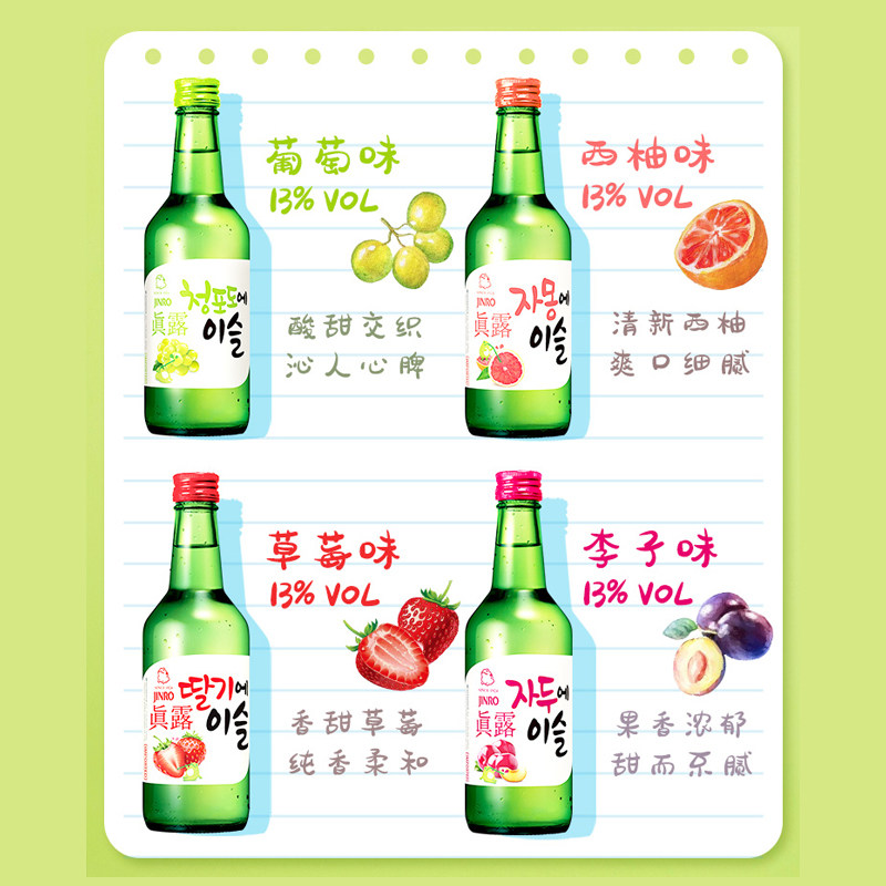 淘宝韩国进口真露烧酒葡萄西柚李子草莓女士微醺低度非清酒13度360ml