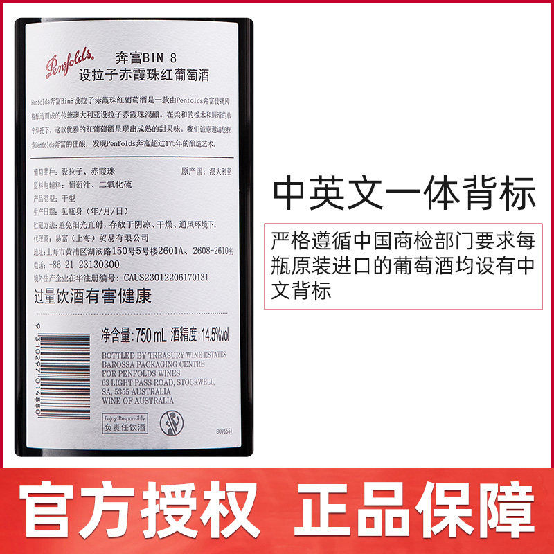【国行正品】Penfolds奔富BIN8干红葡萄酒礼盒装,源自澳大利亚知名酒庄,精选西拉与赤霞珠混酿而成,酒体饱满,口感醇厚,带有黑莓、李子和香料的复杂风味,余韵悠长。BIN8作为奔富经典系列,品质稳定,深受葡萄酒爱好者青睐。本款为国行进口,确保正品保障,包装精美大气,配以高档礼盒,是商务馈赠、节日祝福、亲友聚会的理想之选。无论是搭配牛排、烤肉,还是独自品鉴,都能尽显优雅品味。选择奔富BIN8,传递真诚与格调,让每一刻都值得珍藏。