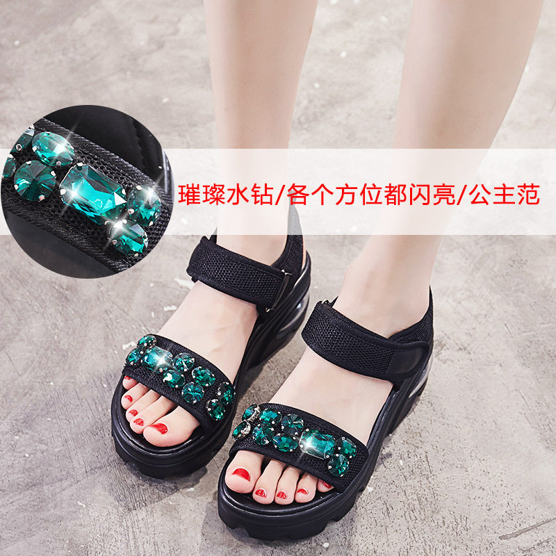 淘宝运动凉鞋女夏2024新款气垫软底厚底松糕增高鞋魔术贴水钻休闲凉鞋