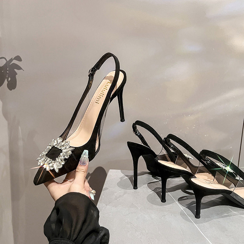 淘宝2025年新款凉鞋包头后空细跟尖头浅口韩版时尚绒面方扣水钻高跟鞋