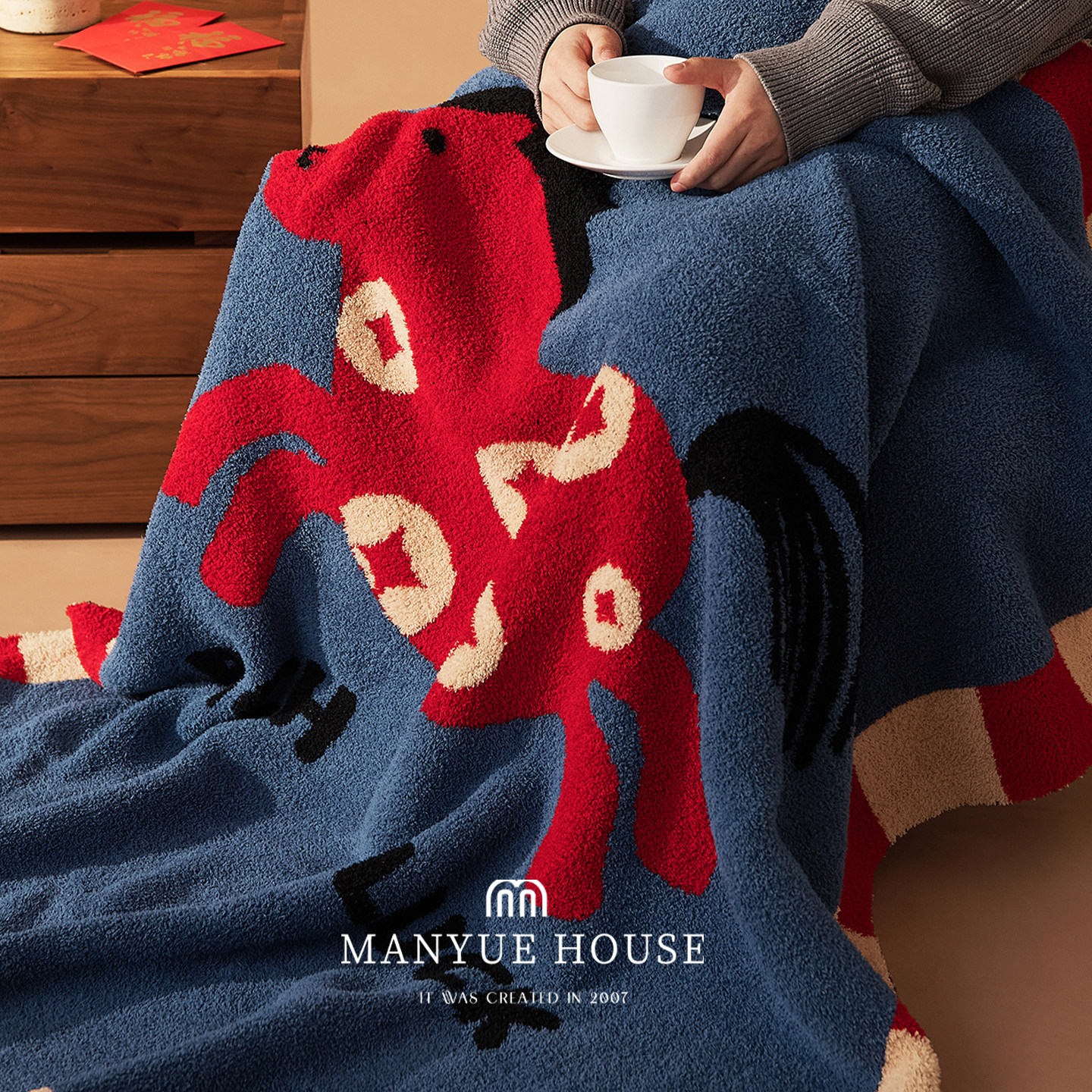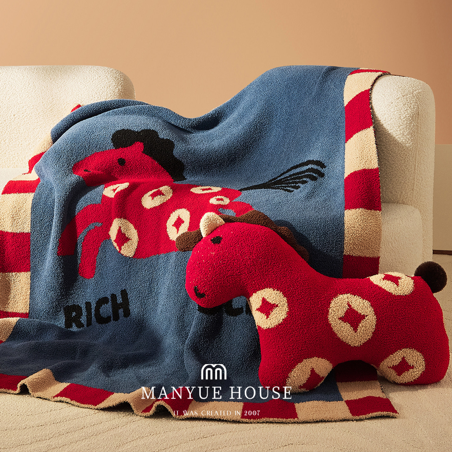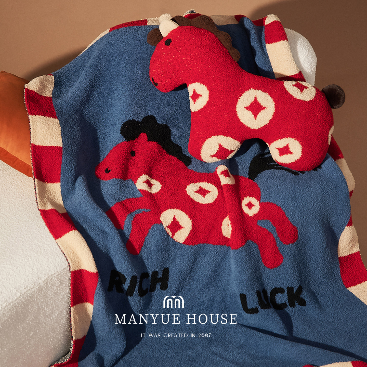 淘宝蔓越家 来财小马 新年客厅沙发吉祥物靠垫半边绒盖毯装饰抱枕玩偶