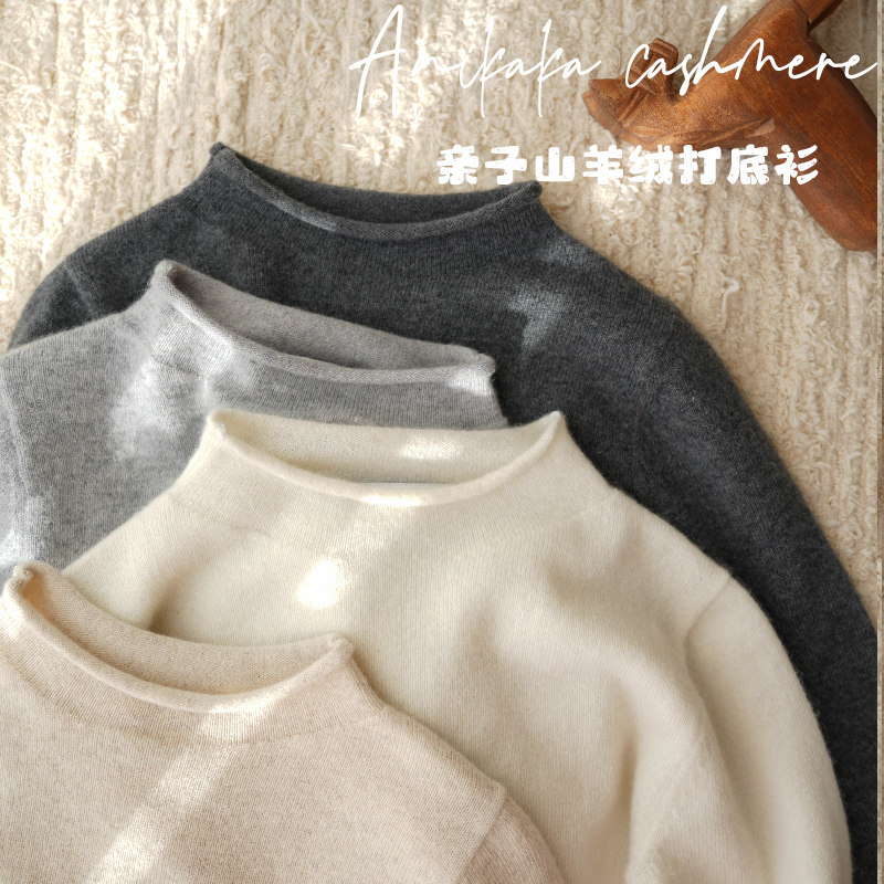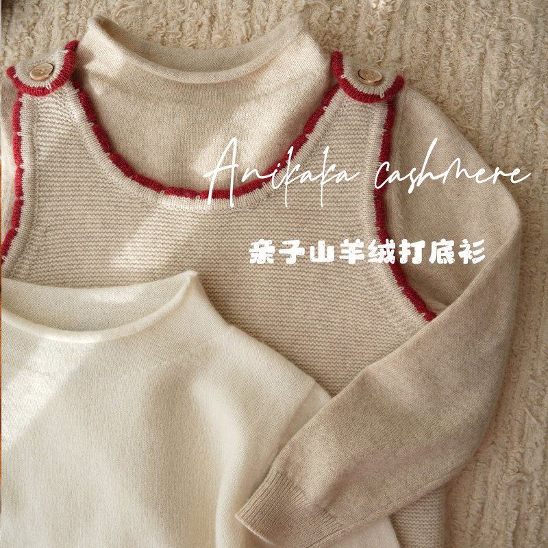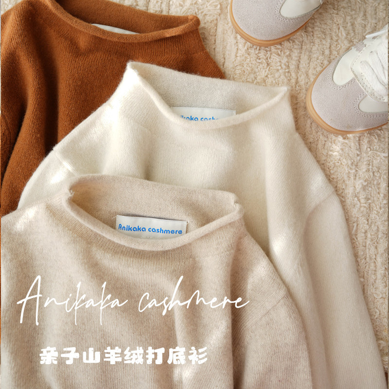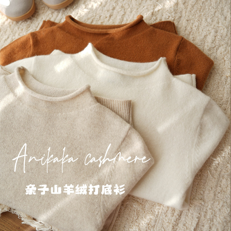 淘宝Anikaka男女宝宝新款纯色卷边亲子装100山羊绒毛衣儿童贴身羊绒衫