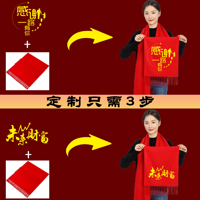 淘宝红围巾定制logo大红色围脖印字订做公司年会聚会结婚庆典披肩刺绣