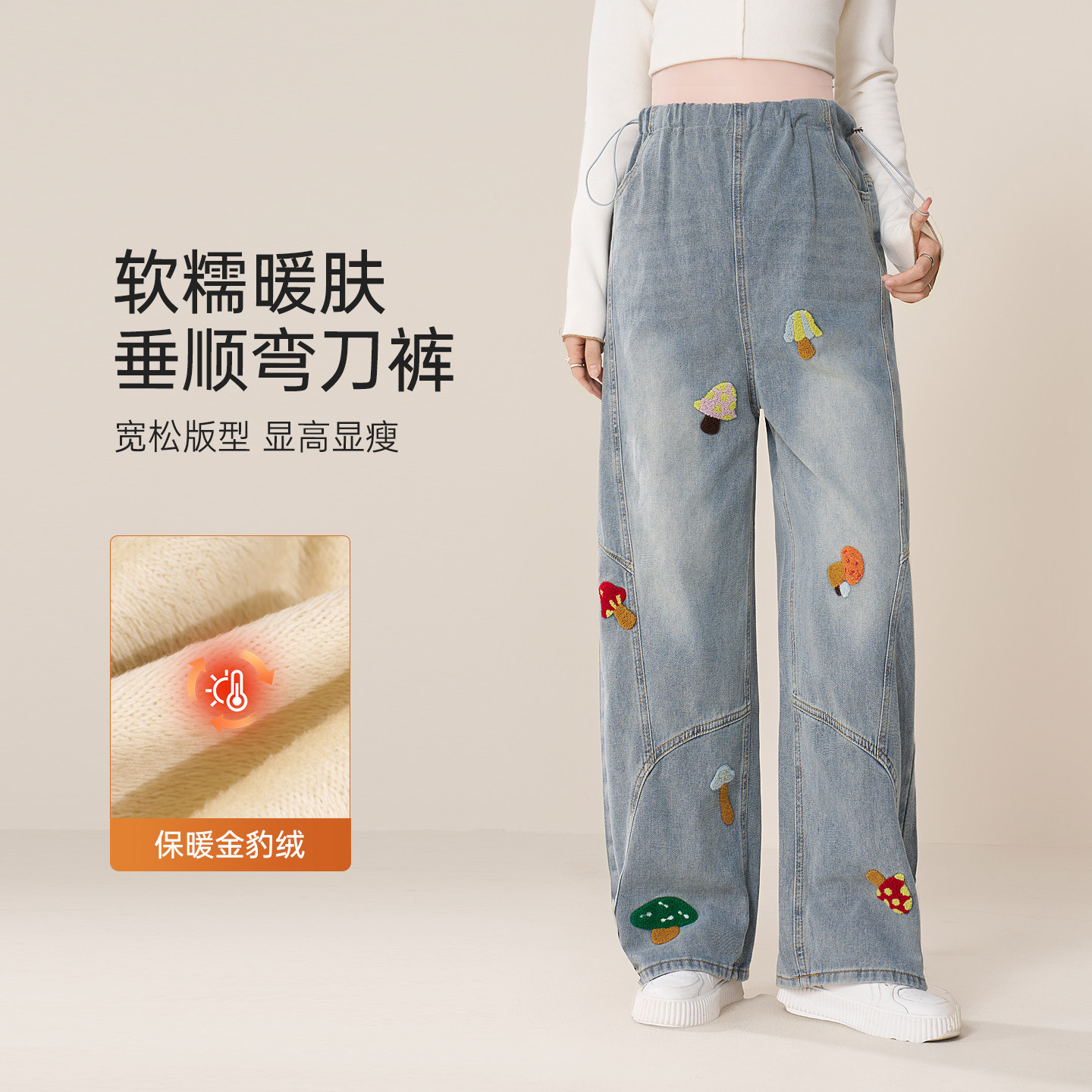 淘孕妇棕色牛仔阔腿裤秋冬外穿加绒加厚时尚宽松休闲直筒阔腿拖地裤