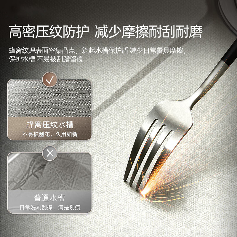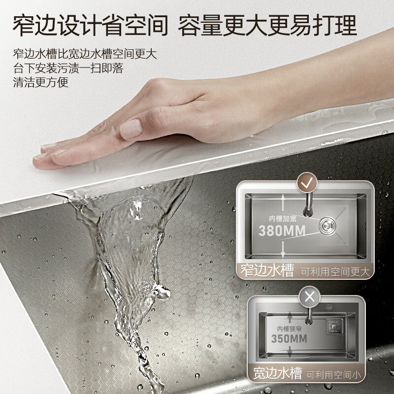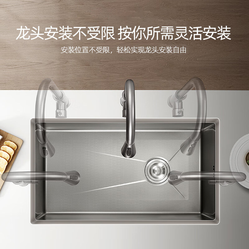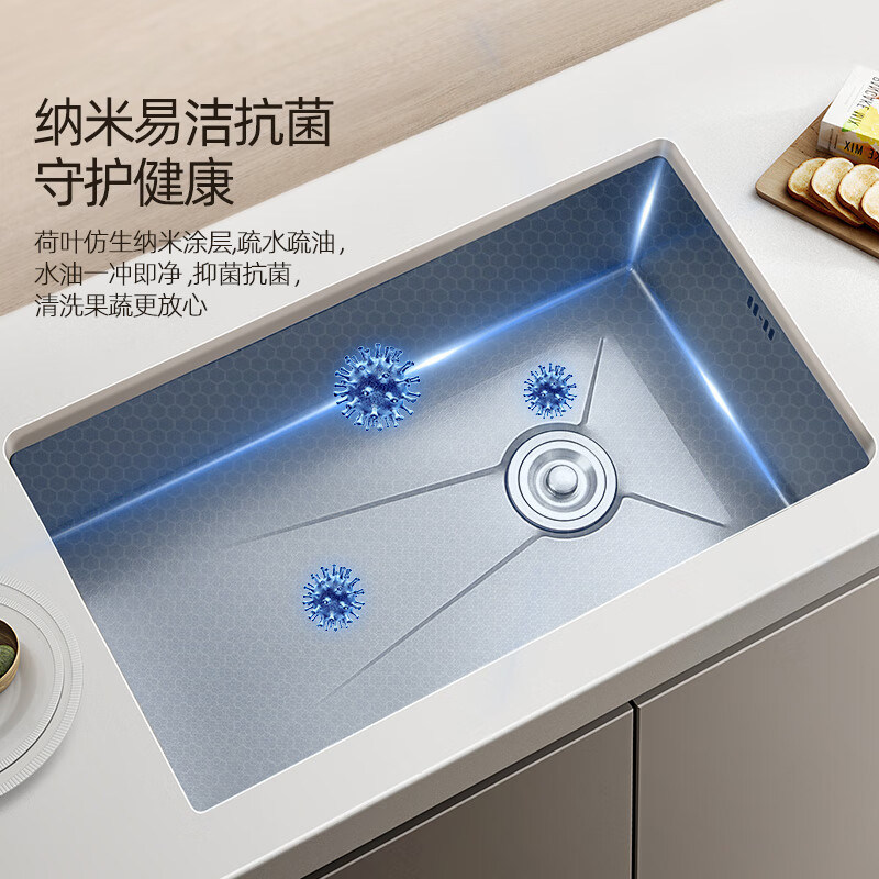 这款厨房水槽采用优质加厚304不锈钢材质,耐腐蚀、抗锈蚀,坚固耐用,使用寿命长。大单槽设计,空间宽敞,可轻松容纳锅碗瓢盆,提升清洗效率。手工精磨工艺,表面细腻光滑,边缘圆润不伤手,质感出众。台下盆安装方式,台面整洁美观,便于清洁,有效防止积水外溢。搭配防冷凝涂层与静音设计,使用更安静舒适。适用于各种现代厨房风格,是家庭厨房的理想之选,兼顾实用性与美观性,让烹饪后的清洁工作更加轻松便捷。
