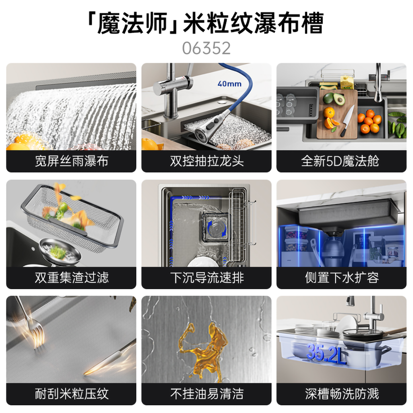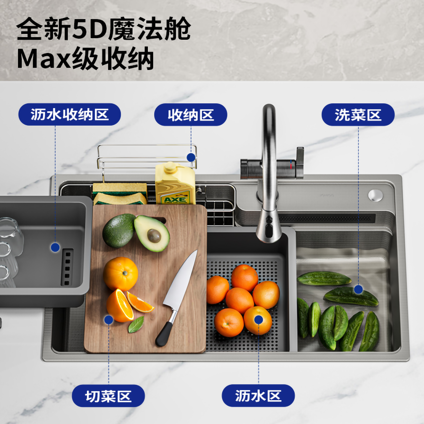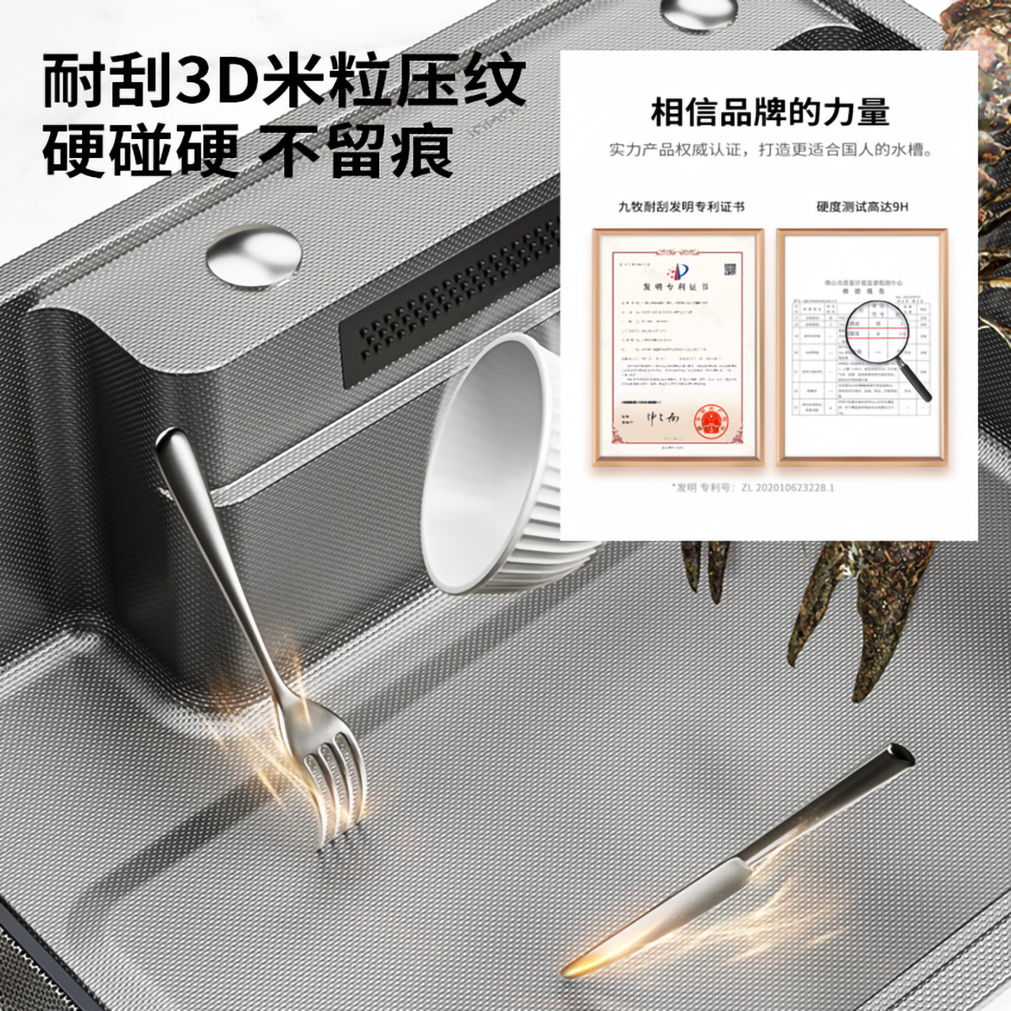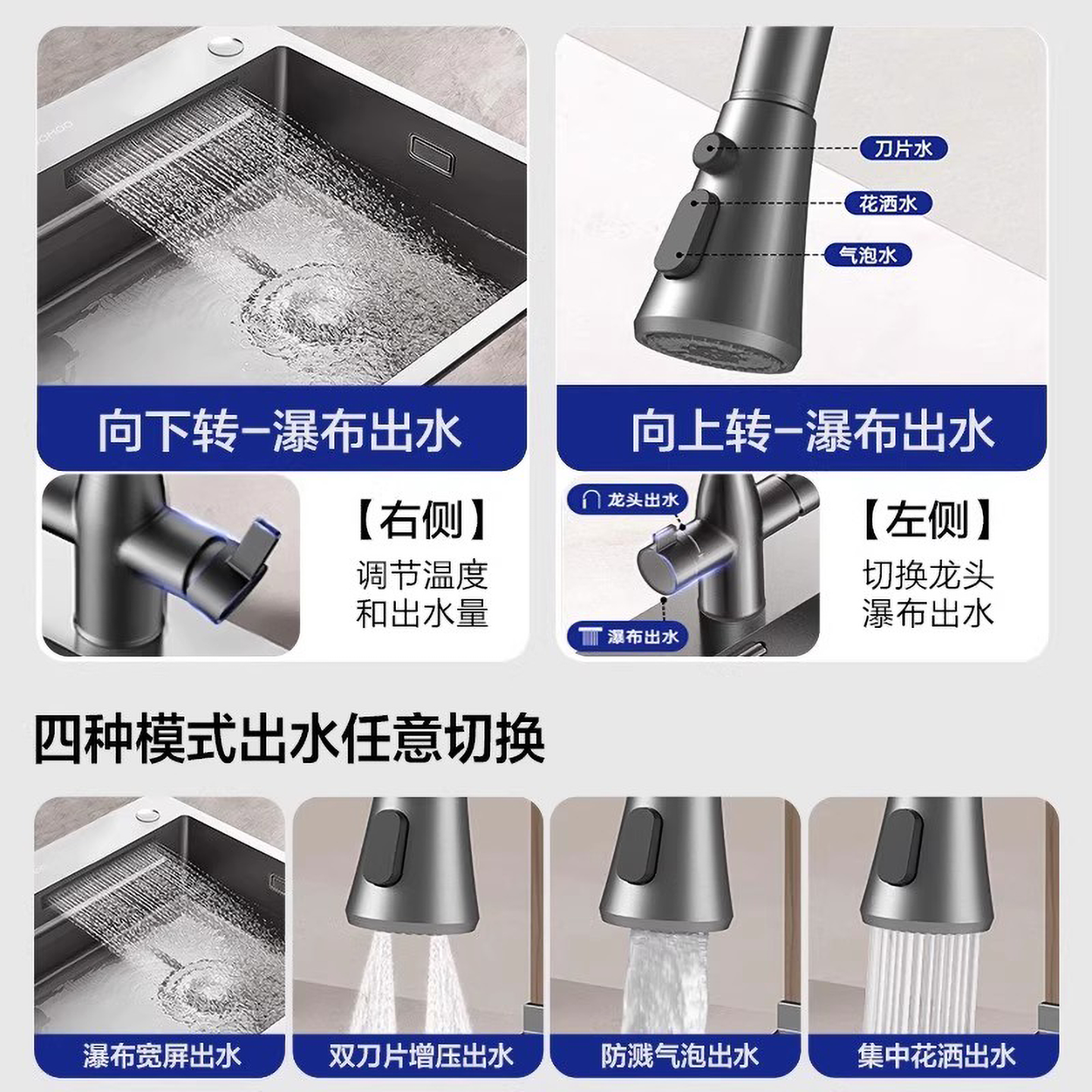 九牧官方正品日式纳米抑菌飞雨瀑布水不锈钢厨房水槽大单槽洗菜盆,采用优质304不锈钢材质,坚固耐用,抗腐蚀易清洁。创新纳米抑菌技术,有效抑制细菌滋生,守护家人健康。独特飞雨瀑布式出水设计,水流柔和均匀,冲洗更高效,节水环保。大单槽结构,空间宽敞,可轻松容纳锅碗瓢盆,满足多种清洗需求。槽体深度适中,防溅设计减少水花外溢。表面精细拉丝工艺,质感细腻,不易留指纹。搭配优质下水系统,排水迅速防堵塞。整体设计简约大气,契合现代厨房美学,是提升厨房品质的理想之选。