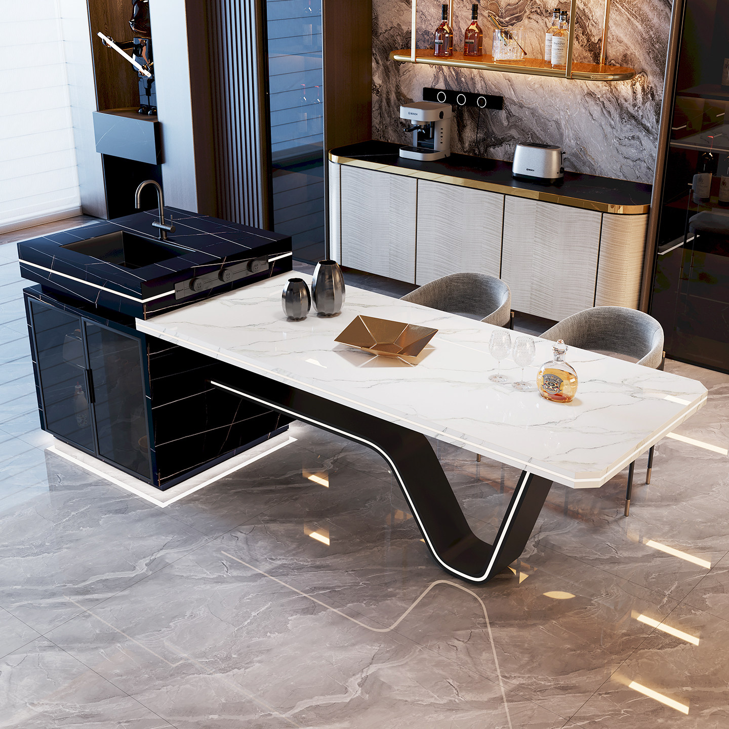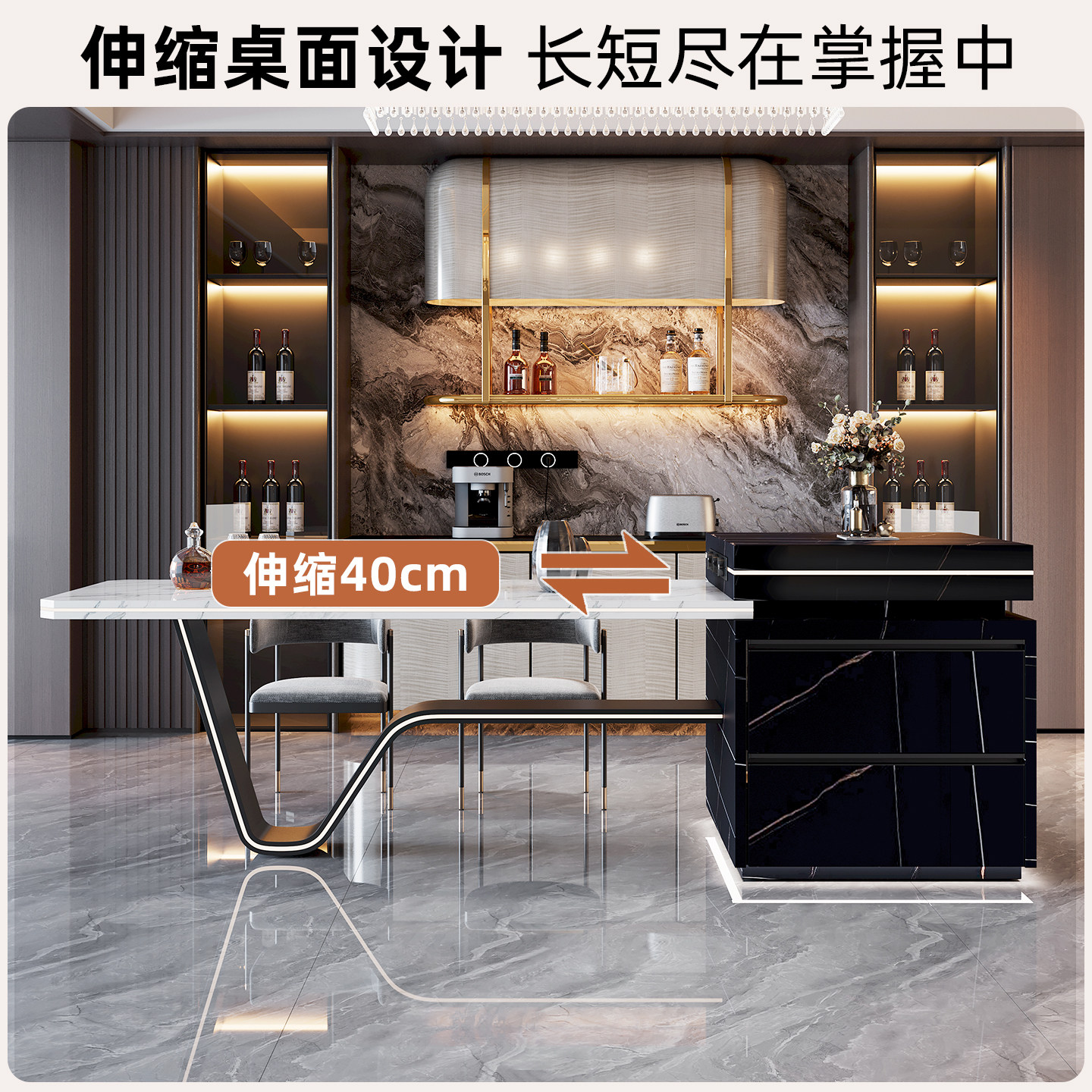 这款高端岩板岛台一体餐桌,融合意式设计美学与实用功能,采用劳伦黑金与鱼肚白双色调岩板台面,纹理自然大气,质感温润高级。创新“龙抬头”可伸缩结构,轻松调节台面长度,满足日常用餐与多人聚会需求。集成隐形导台与嵌入式不锈钢水槽,实现洗切备餐一体化,提升厨房效率。整体线条简约流畅,兼具现代感与艺术性,既是厨房核心操作区,也是家居空间的视觉焦点。适用于开放式厨房、别墅大宅,彰显主人不凡品味与生活格调。