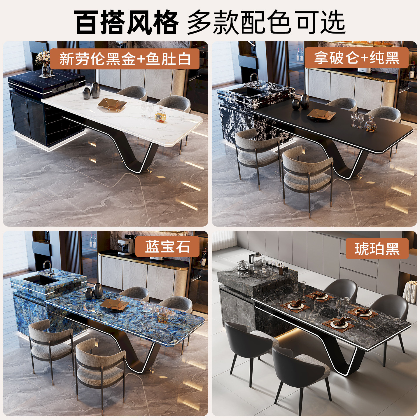 淘宝高端岩板岛台一体餐桌可伸缩龙抬头意式导台带水槽劳伦黑金鱼肚白