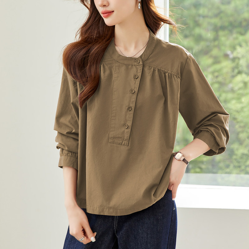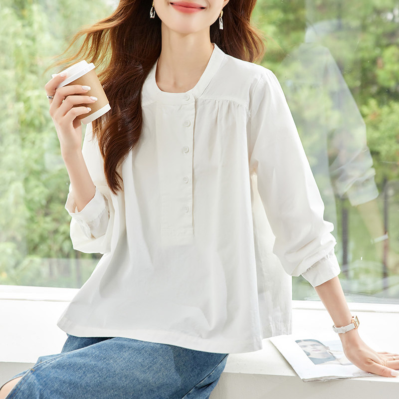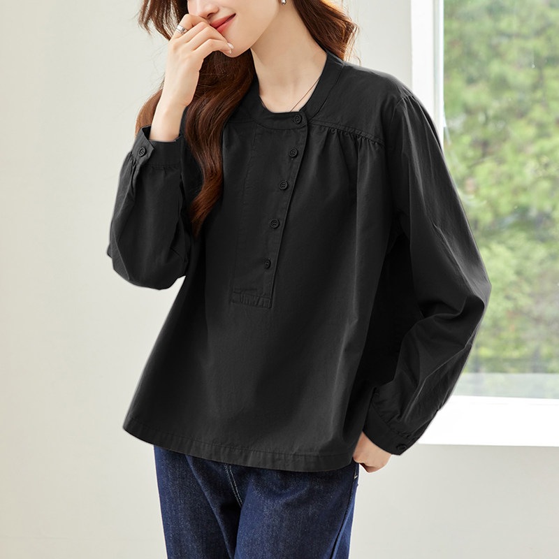 天猫初影 圆领衬衫女长袖2026春装新款国风设计感上衣新中式纯棉衬衣