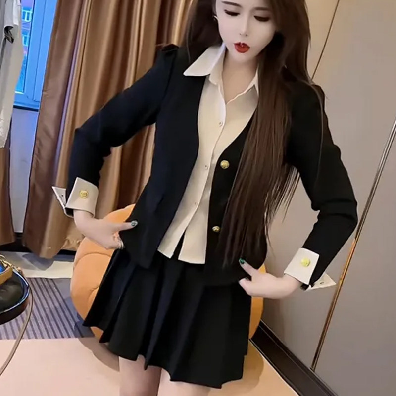 淘宝早秋穿搭一整套女欧货高端时尚撞色假两件衬衫高腰百褶短裙两件套