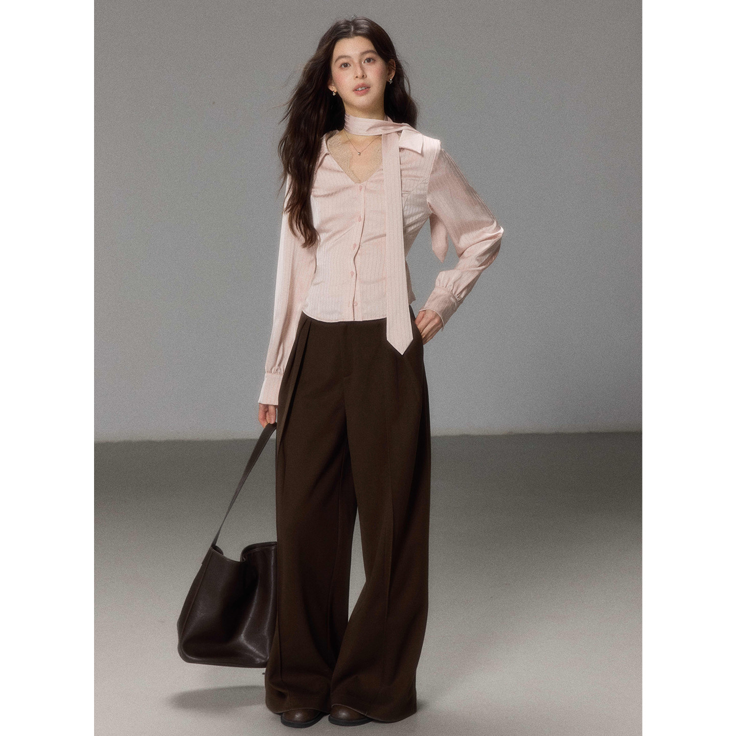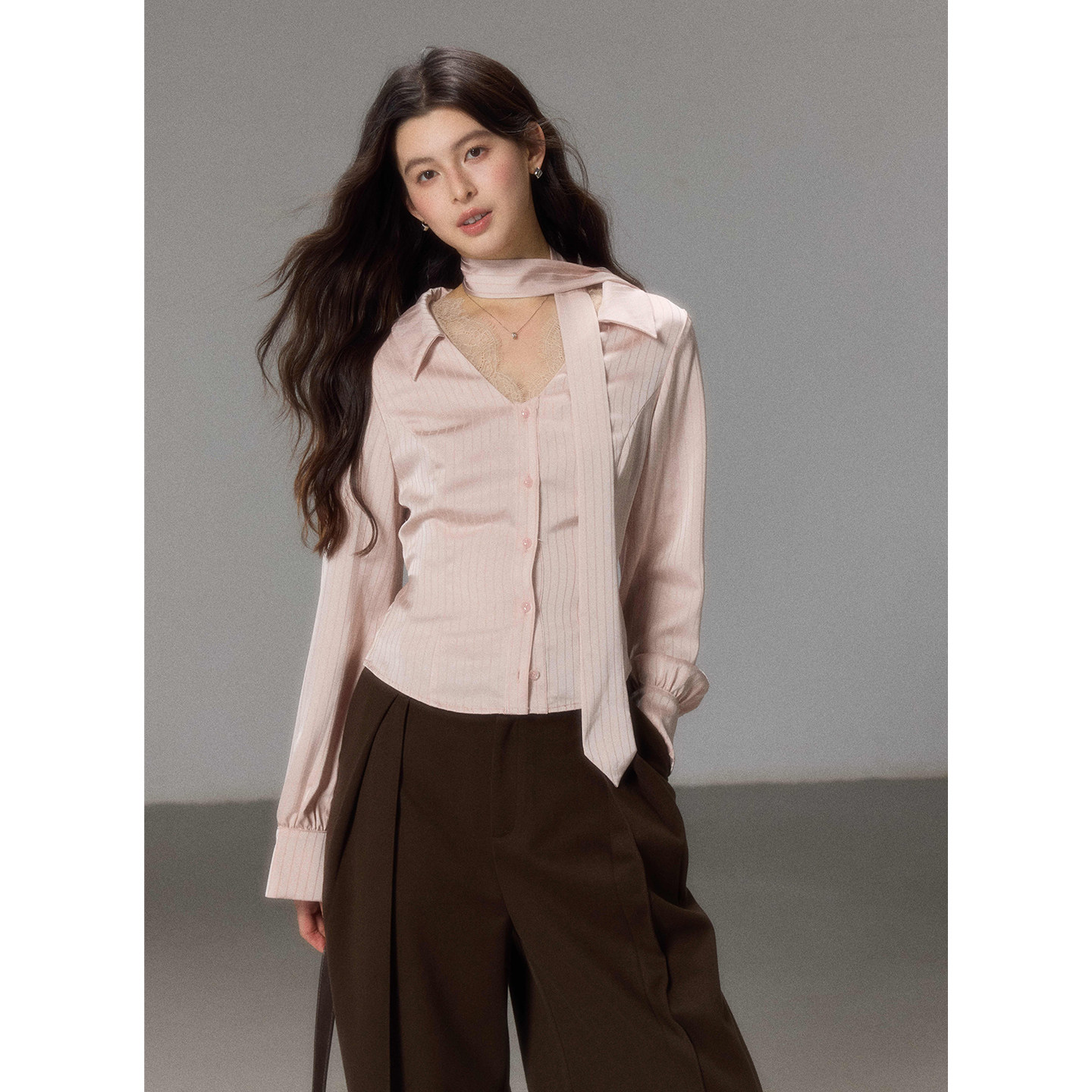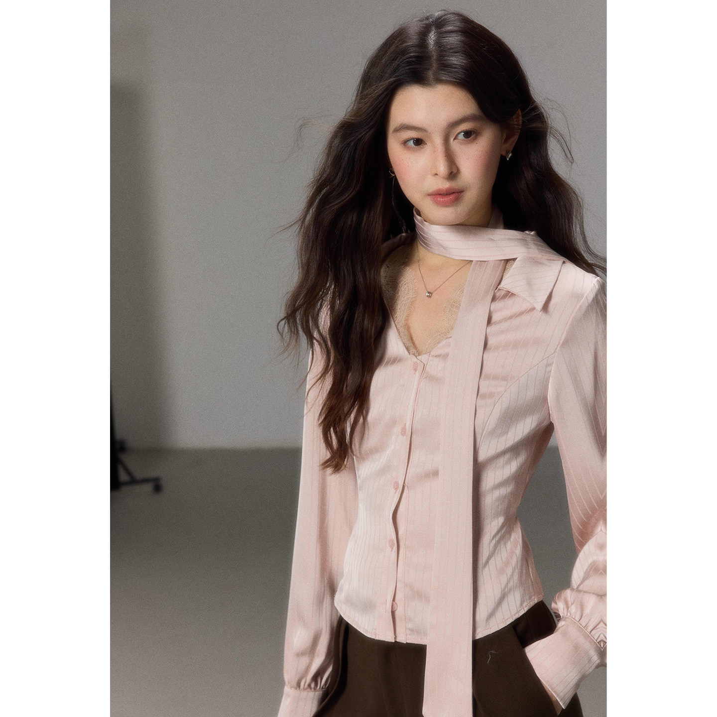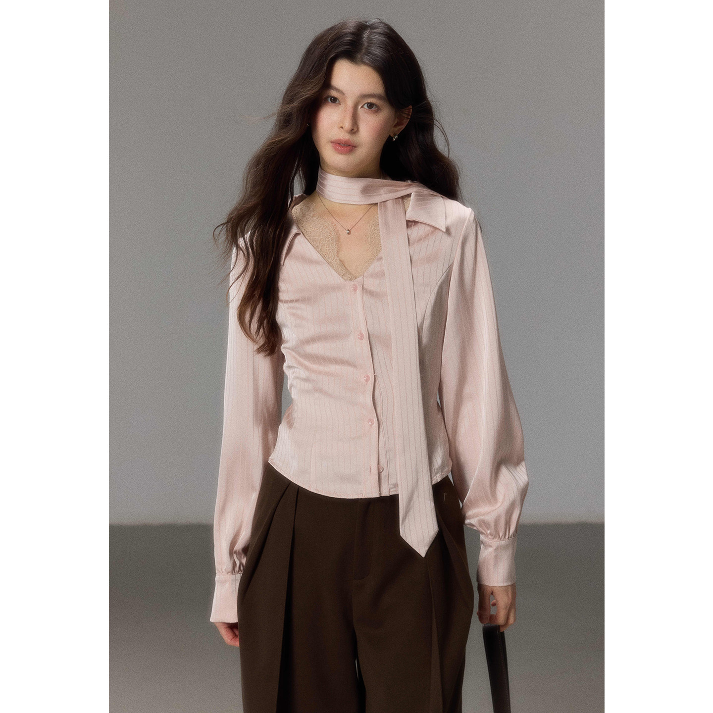 FINITY菲妮迪衬衫2026春新款简约粉色飘带领宽松通勤长袖衬衣女装