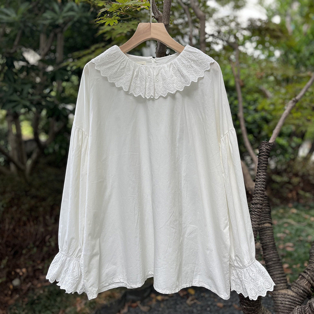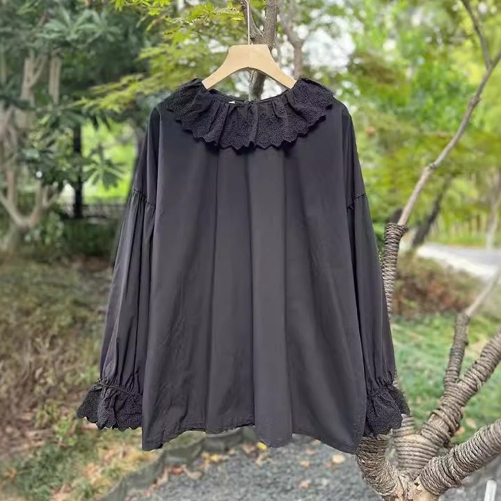 淘宝森系甜美花边领长袖纯色娃娃衫宽松百搭灯笼袖纯棉套头衬衫上衣女