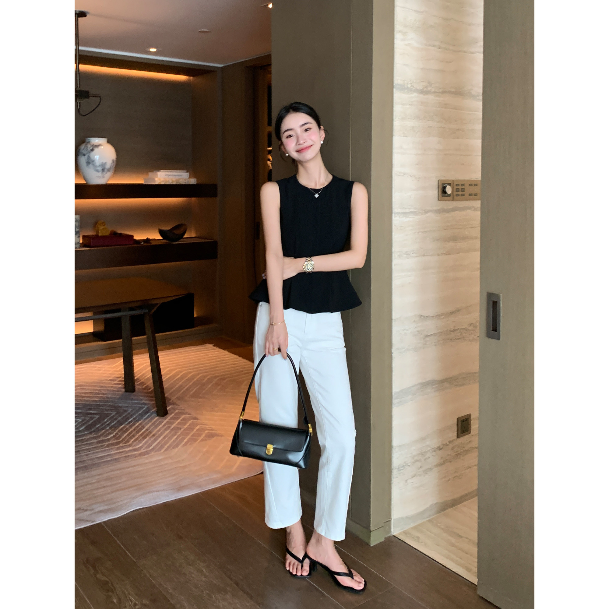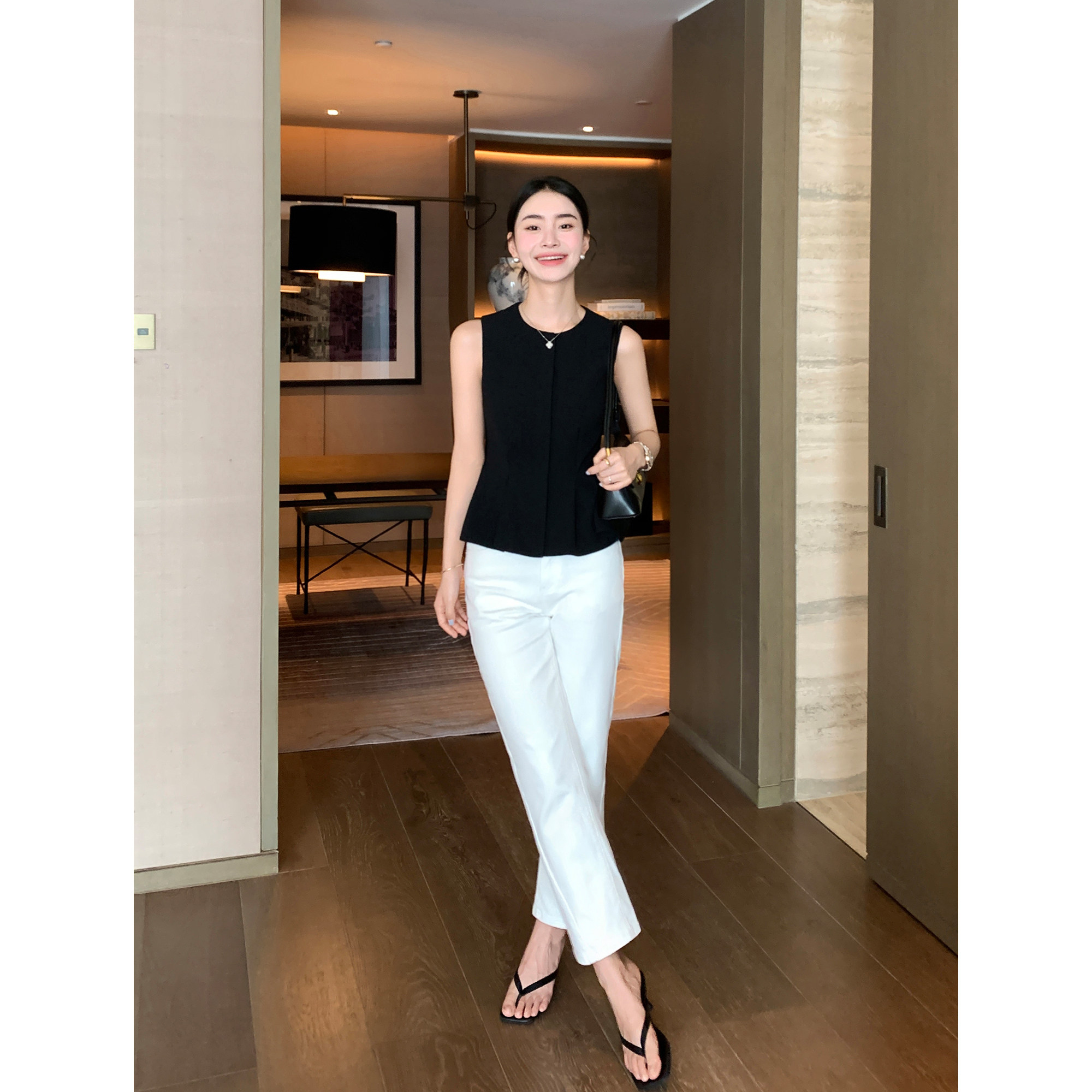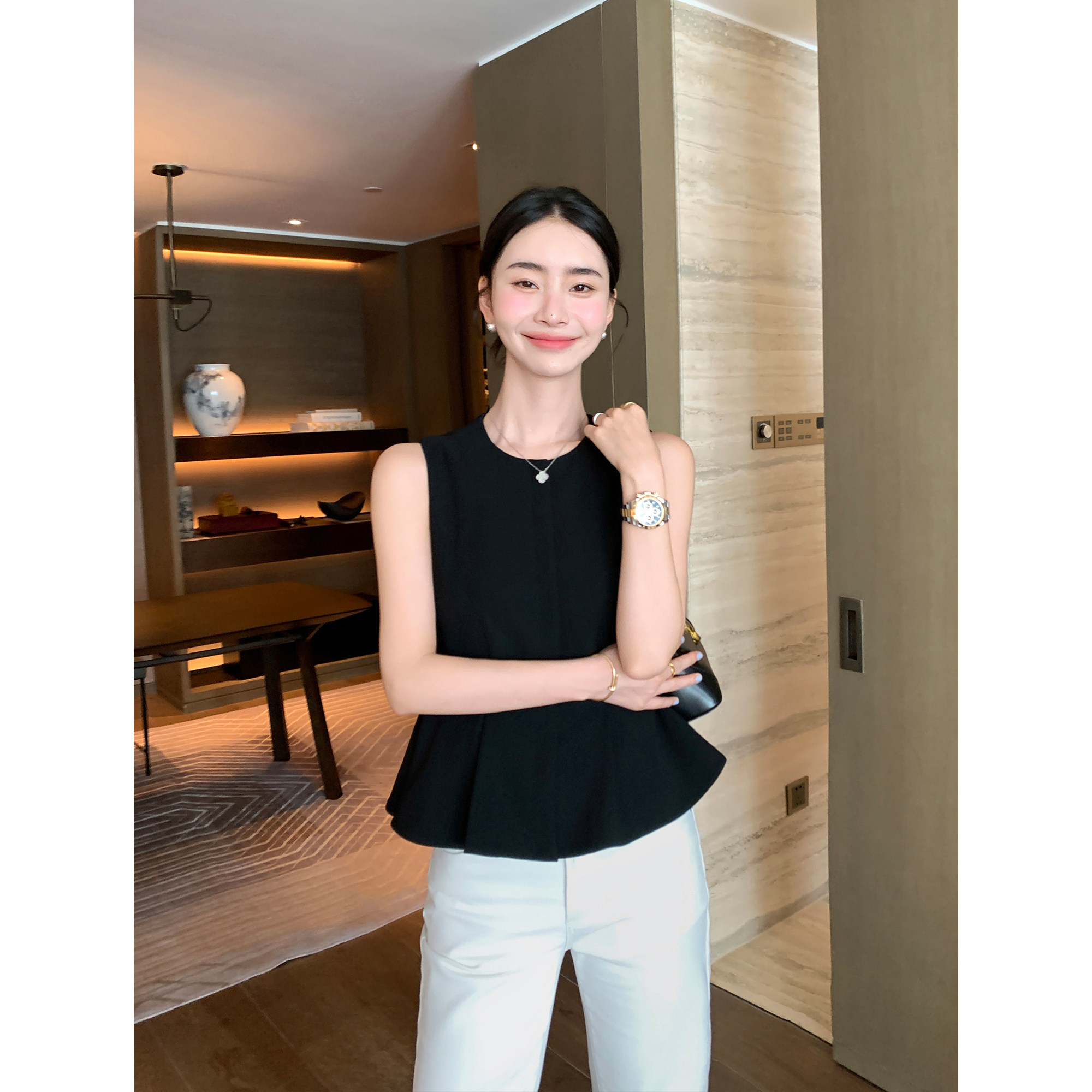MavenLin高智白领黑色醋酸衬衫女无袖圆领收腰荷叶边背心上衣,专为都市职场女性打造,融合优雅与干练。采用高品质醋酸面料,触感柔滑、垂坠感佳,兼具真丝光泽与易打理特性。经典圆领设计简约大方,无袖剪裁凸显手臂线条,收腰版型勾勒曼妙身姿,下摆精致荷叶边点缀,增添柔美气息,轻松应对通勤与轻社交场合。黑色百搭显瘦,无论是搭配西装裤、半身裙或外套,皆能展现知性气质与时尚品味,是现代白领衣橱中不可或缺的时尚单品。