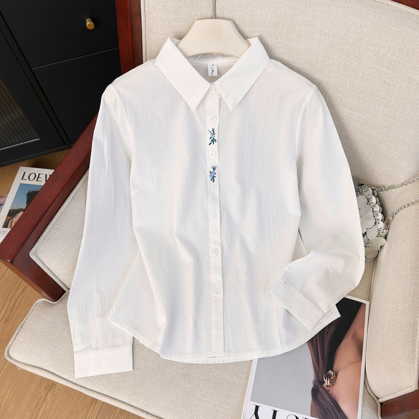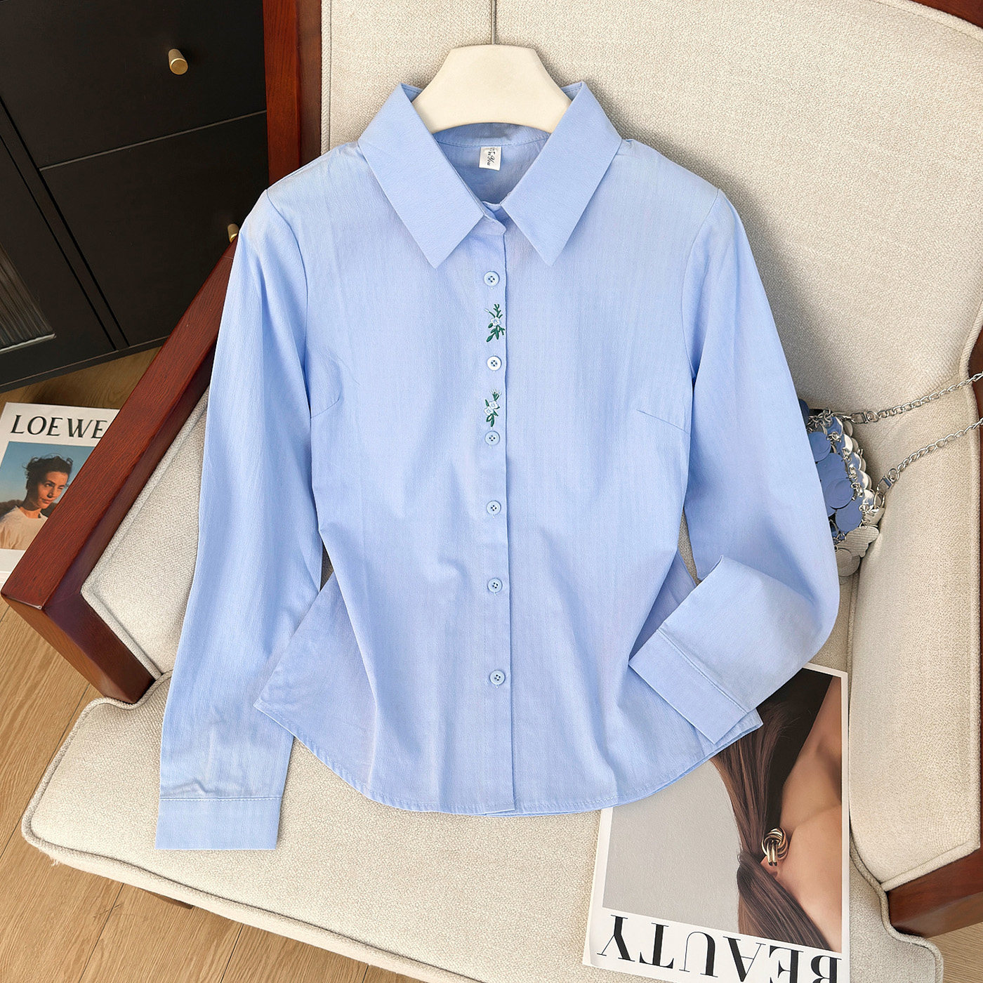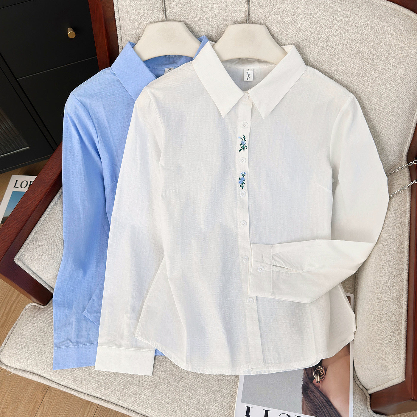 天猫蓝色衬衫女2026春季新款通勤职场风花卉刺绣纯棉衬衣长袖全棉上衣