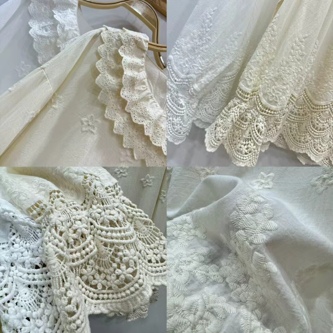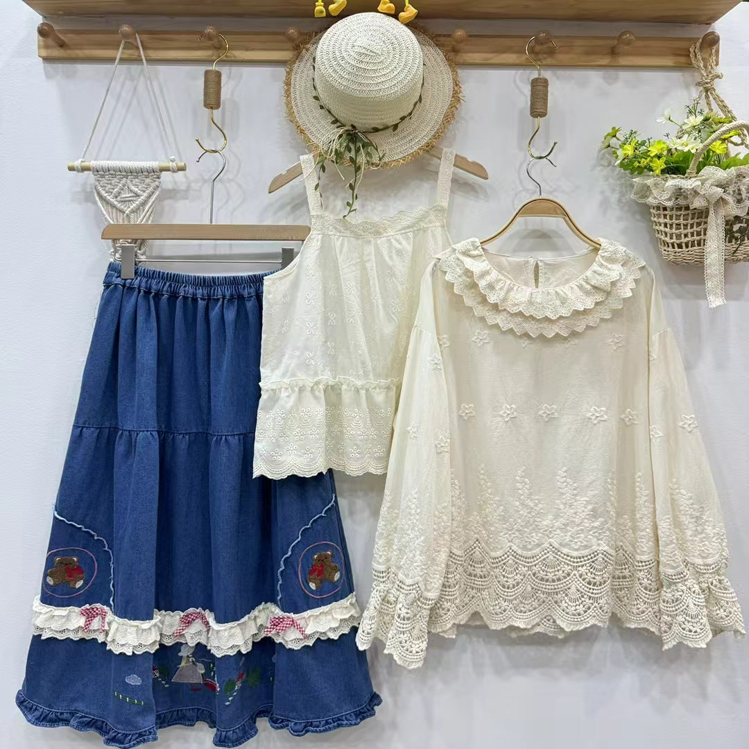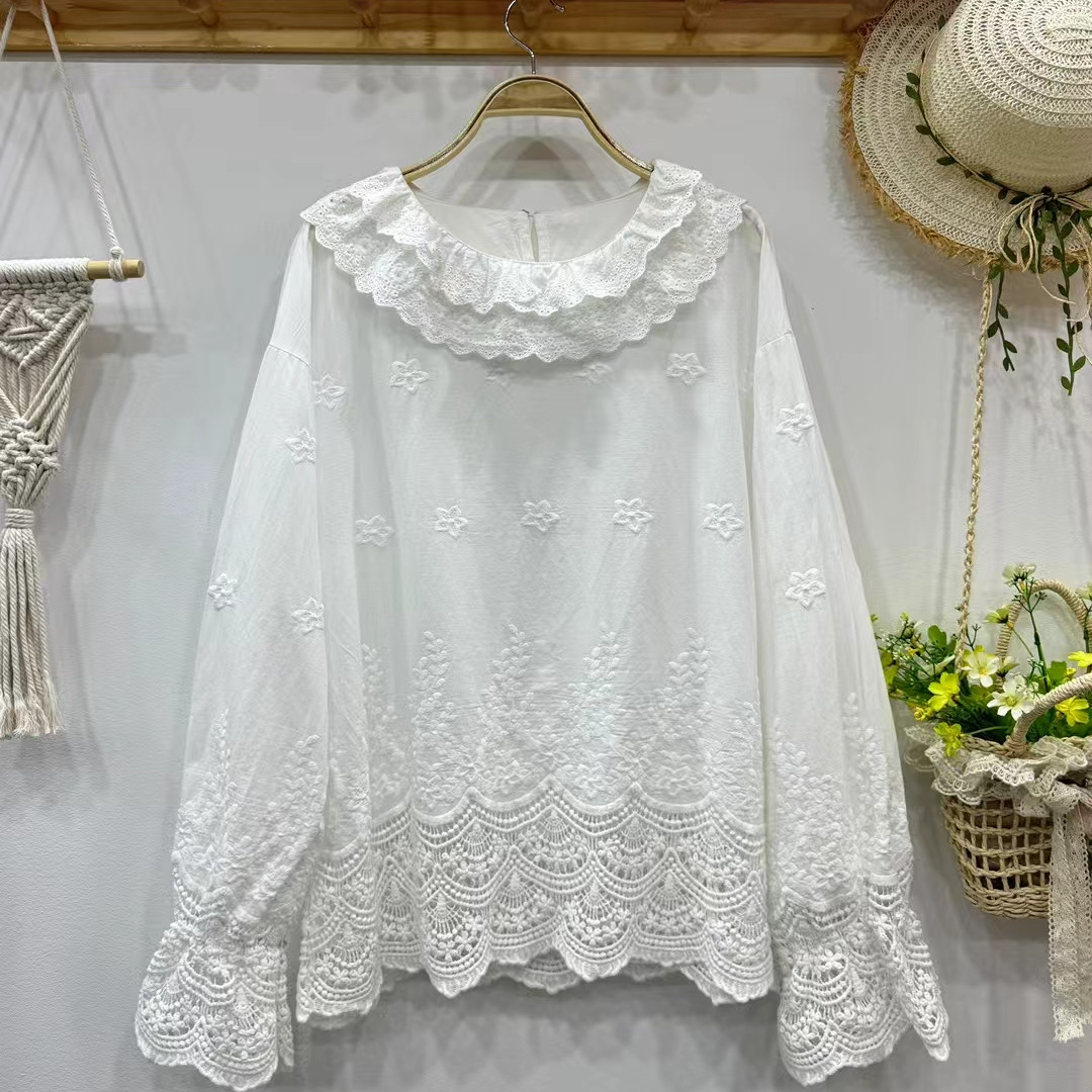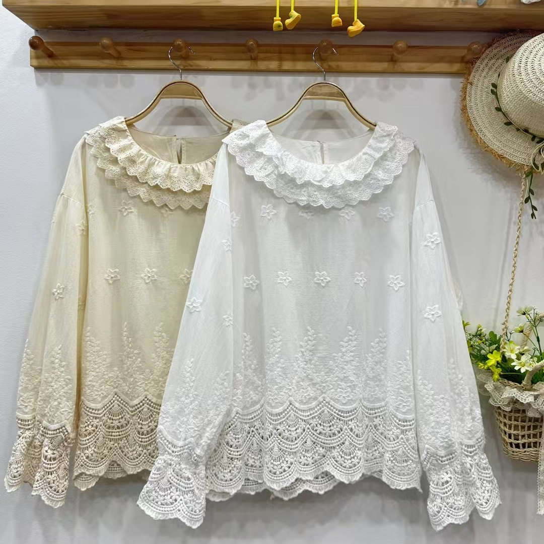 淘宝森系减龄钩花刺绣双层花边领纯棉衬衫宽松甜美小清新套头长袖上衣