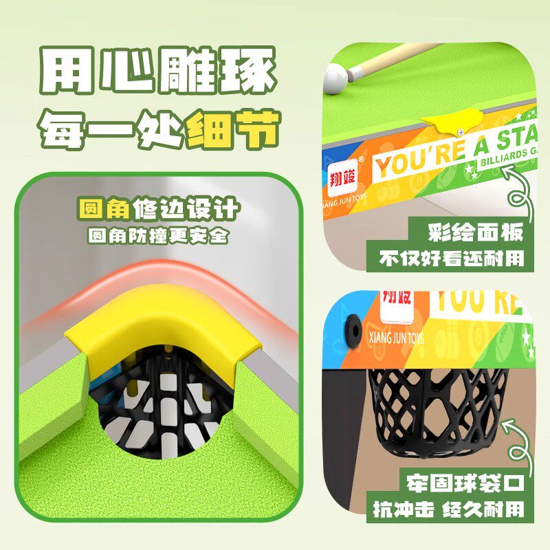 这款家用迷你台球桌专为成人与儿童设计,适合12岁及以上青少年及家庭娱乐使用。采用标准比例缩小设计,兼顾趣味性与竞技感,是培养孩子专注力、空间思维和手眼协调能力的优质益智玩具。桌面选用高密度纤维板,搭配优质绒布,击球顺滑静音;球杆轻便耐用,小球圆润安全,呵护孩子使用体验。可折叠设计节省空间,轻松收纳于墙角或柜中,适合客厅、卧室或儿童房。无需复杂安装,即摆即玩,全家共享亲子时光。无论是休闲娱乐还是启蒙训练,这款迷你台球桌都是家庭娱乐的理想选择,让快乐与健康成长相伴。