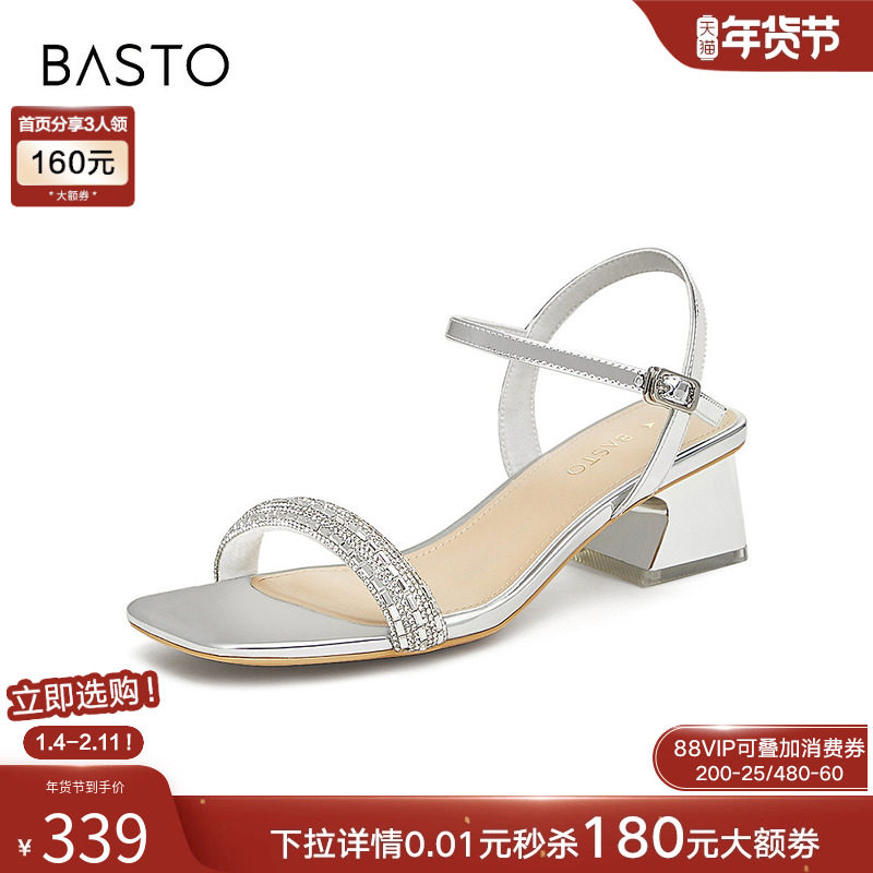 天猫百思图高光鞋夏商场新款气质闪钻粗跟女一字带银色凉鞋TT109BL4