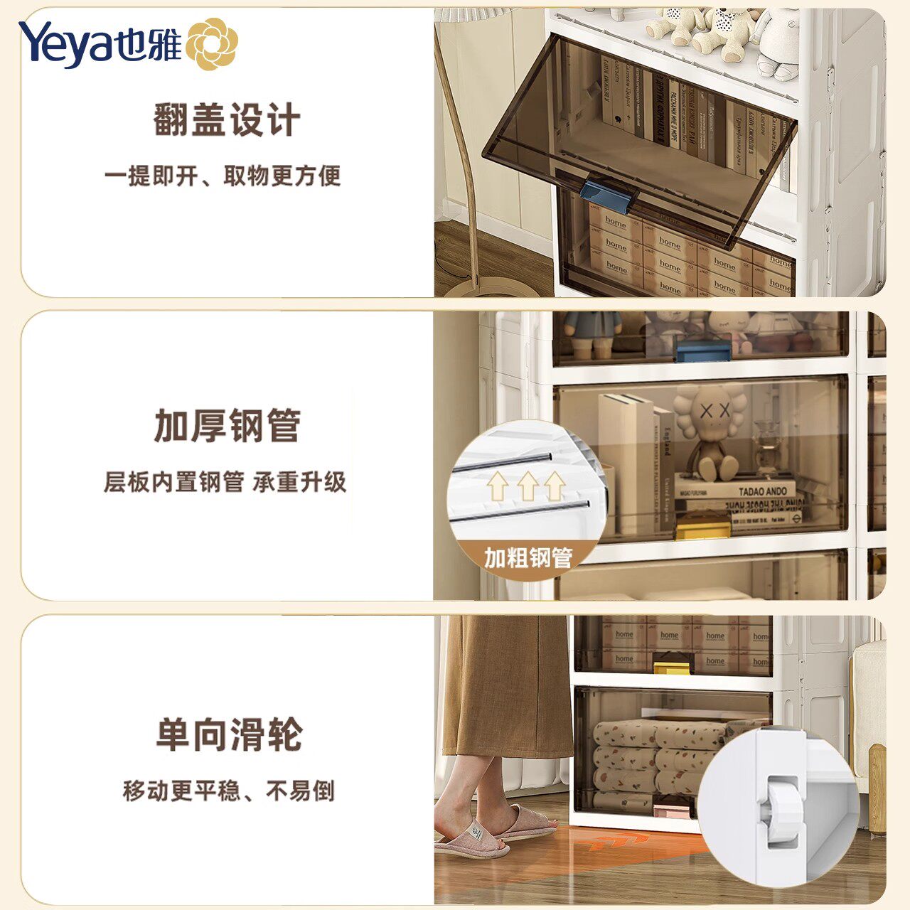 也雅收纳柜是一款实用便捷的家用多层置物柜,采用环保耐用塑料材质,结构稳固且防潮防霉。柜体设计简洁大方,分层合理,可轻松收纳衣物、被褥、玩具、书籍等日常杂物,有效提升空间利用率。支持灵活折叠组装,无需工具即可快速安装,拆卸也方便,适合租房族或空间有限的家庭使用。多款式多容量可选,满足不同场景需求,如卧室、客厅、儿童房或阳台等。轻便易移动,底部带防滑脚垫,安全稳固。也雅收纳柜以高性价比和人性化设计,成为现代家庭整理收纳的理想选择,让家居环境更整洁有序。
