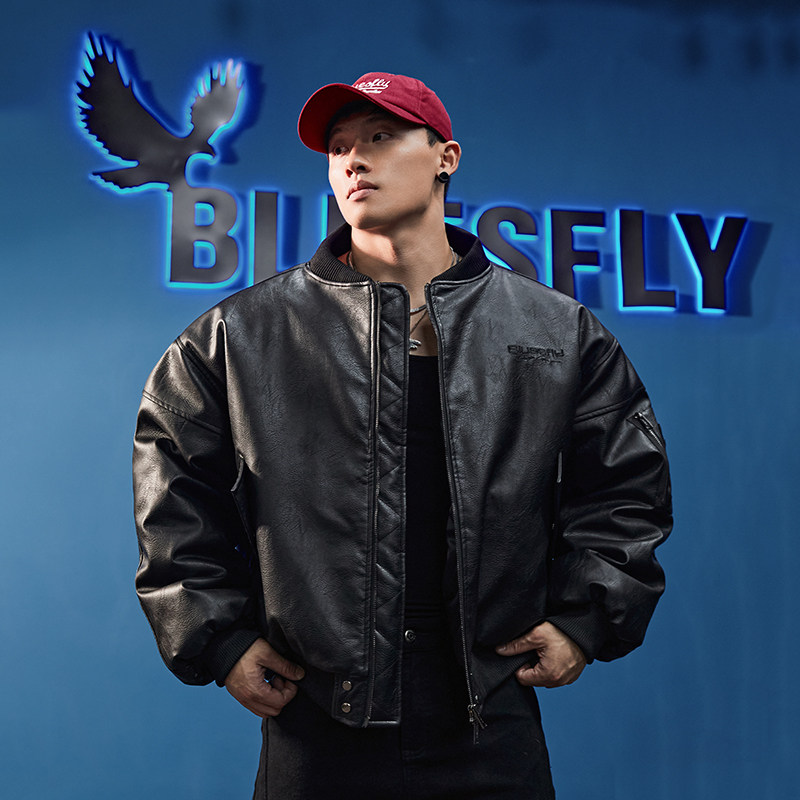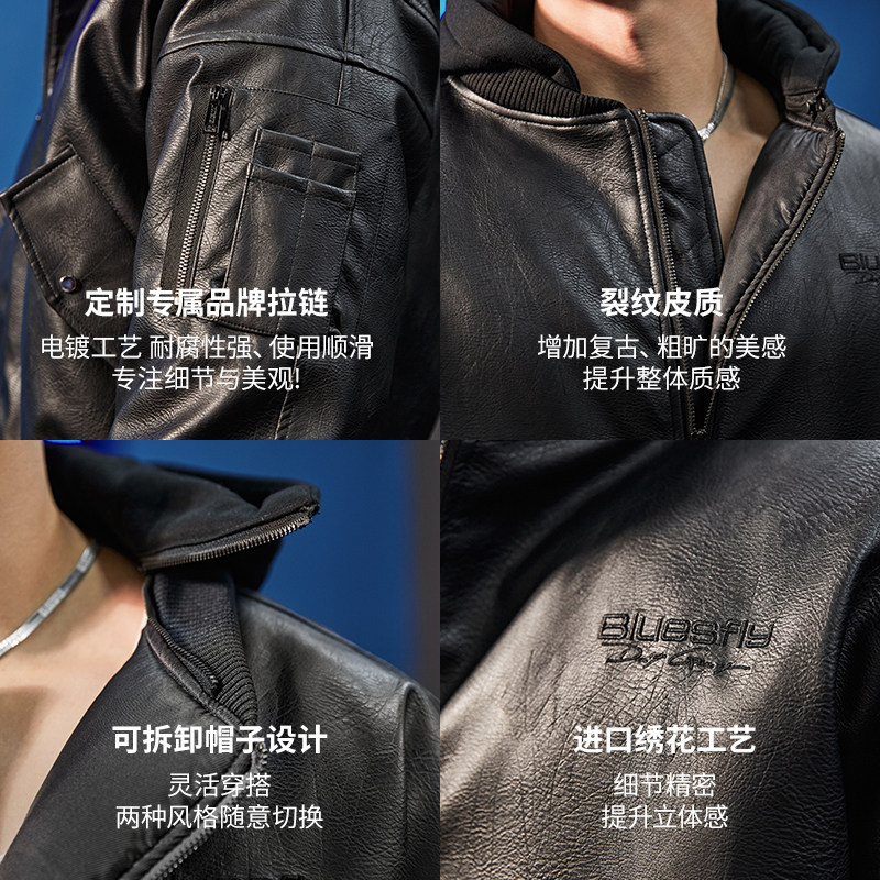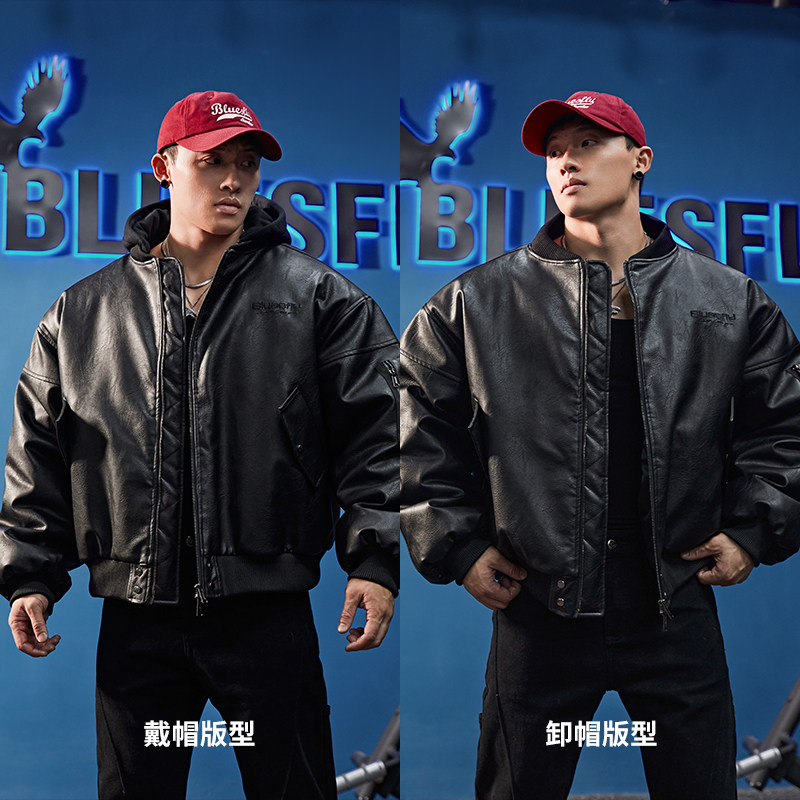 淘宝BLUESFLY美式机车皮衣夹克外套男棉服冬两穿可拆卸连帽保暖高级感