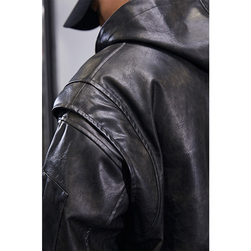 淘美式复古立体裁剪PU皮衣夹克男春秋宽松荔枝纹户外机能服翻领外套