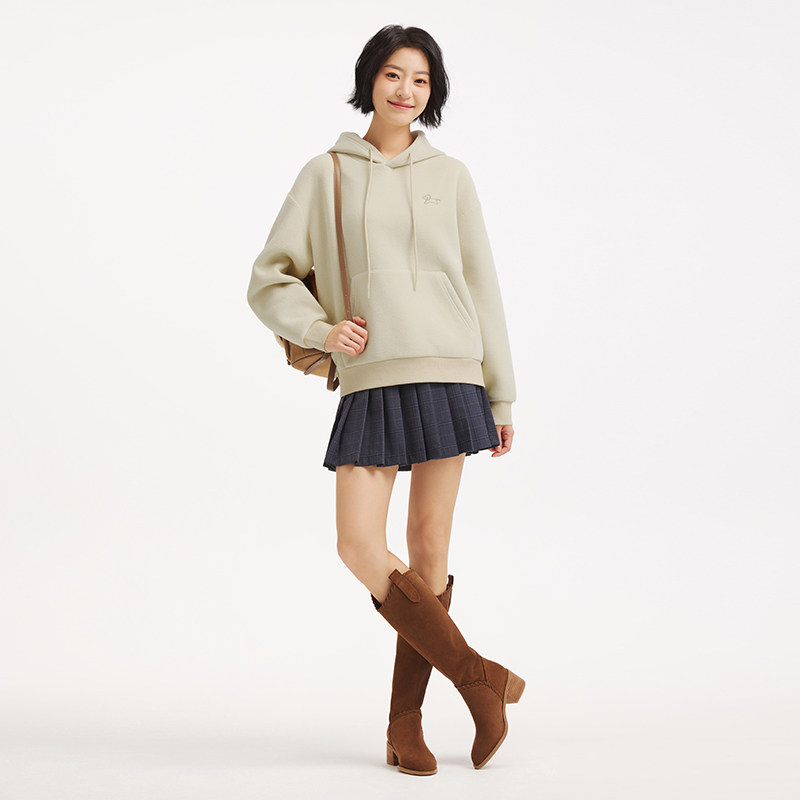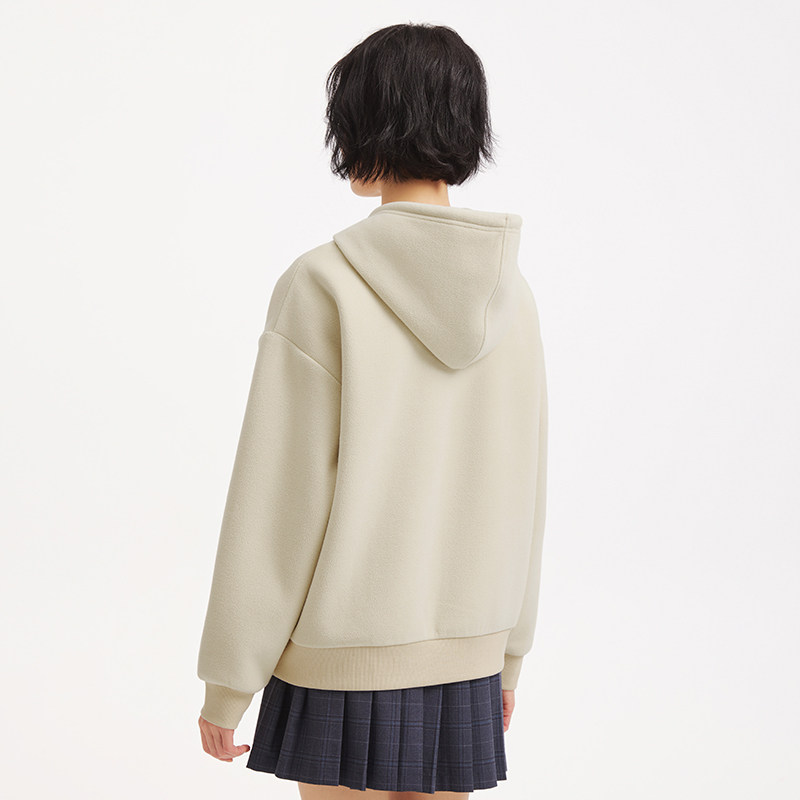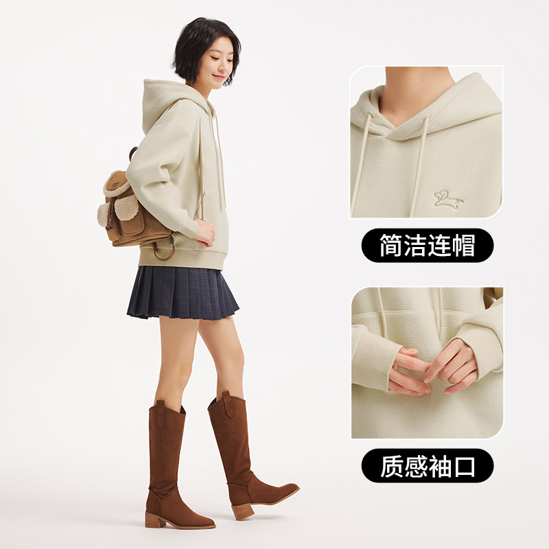 天猫热风女士毛绒卫衣2025年冬季新款双面摇粒绒连帽卫衣保暖厚款卫衣