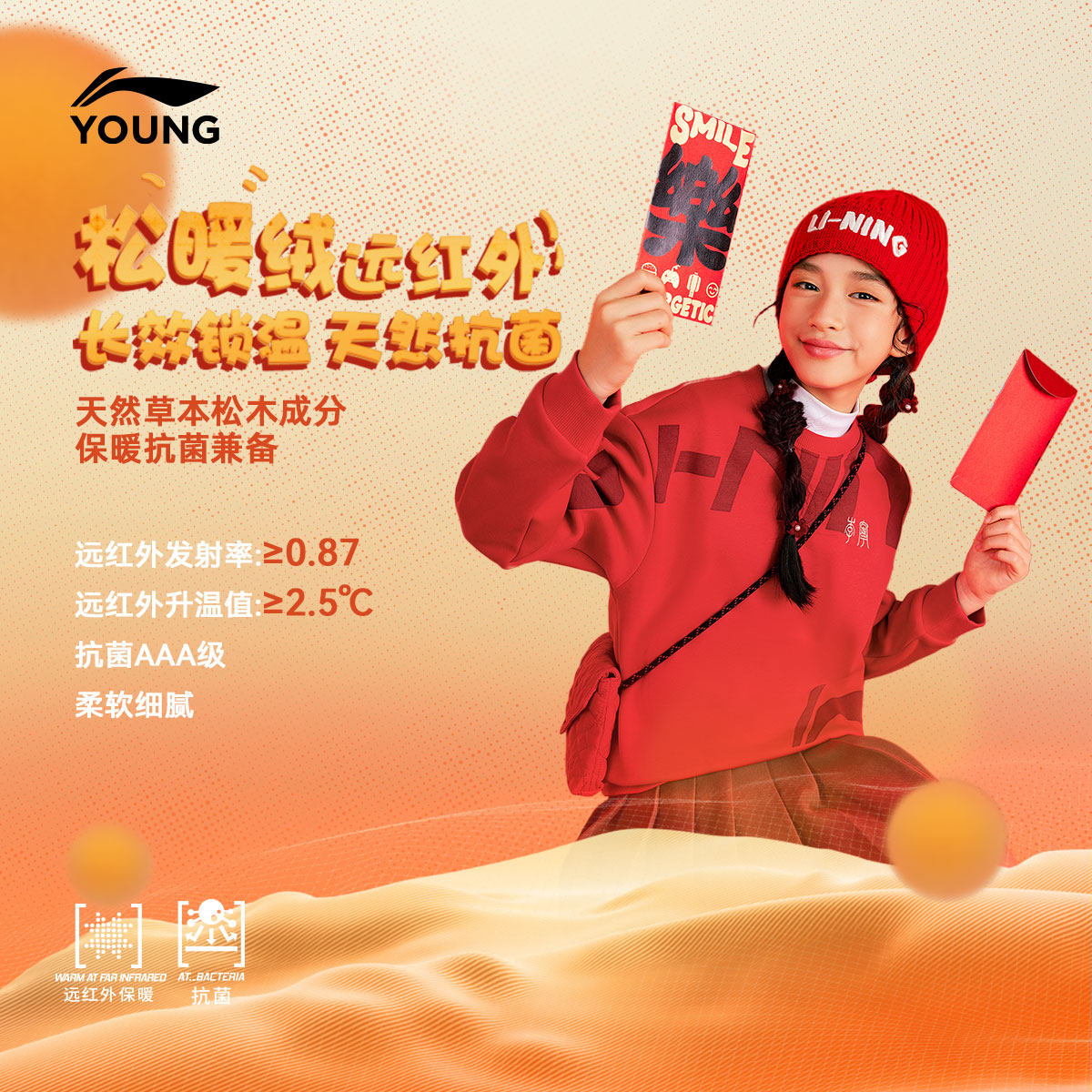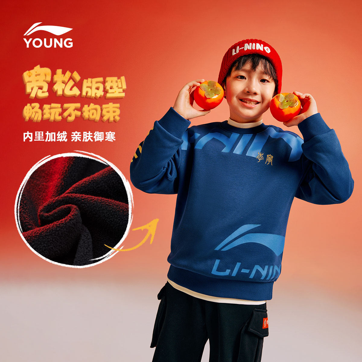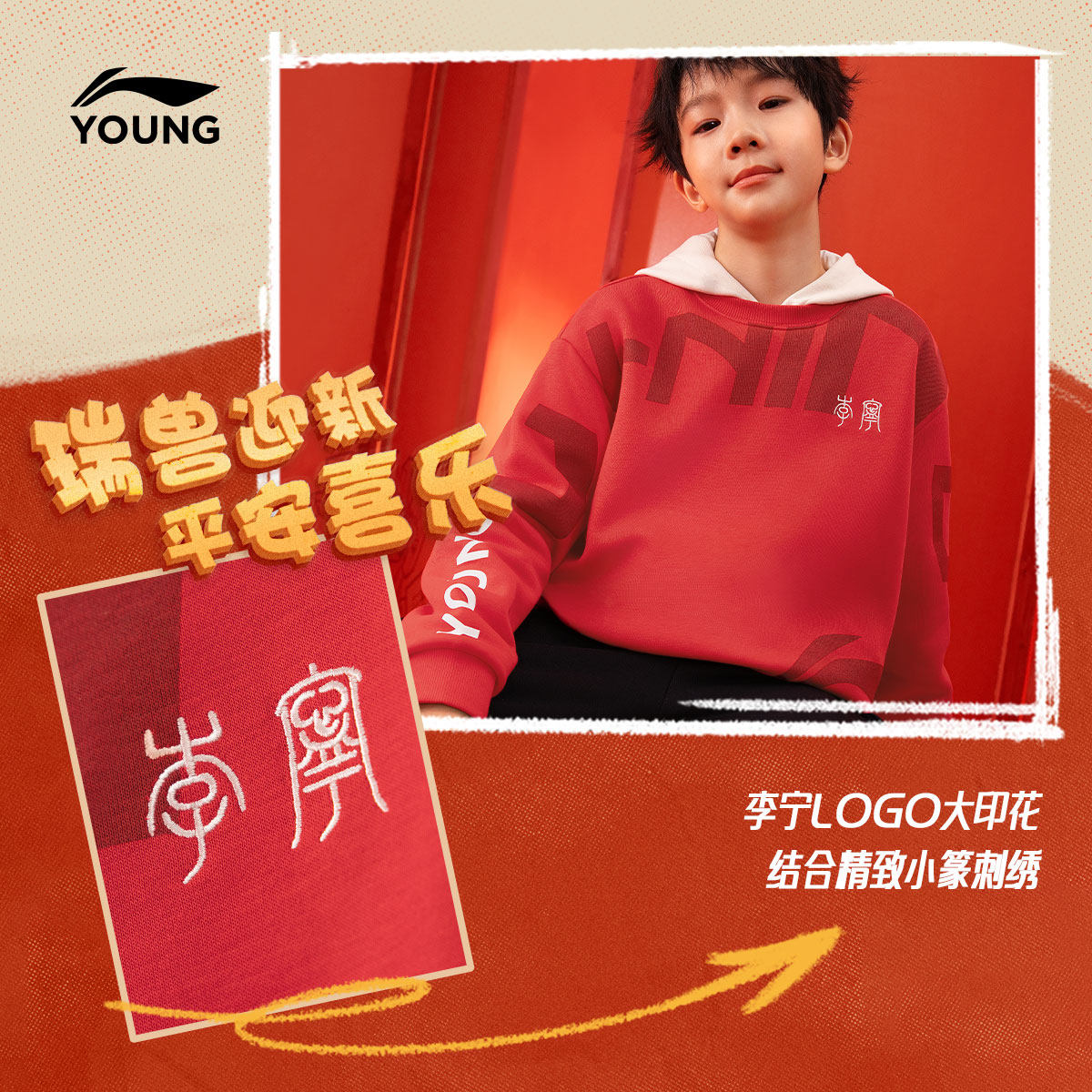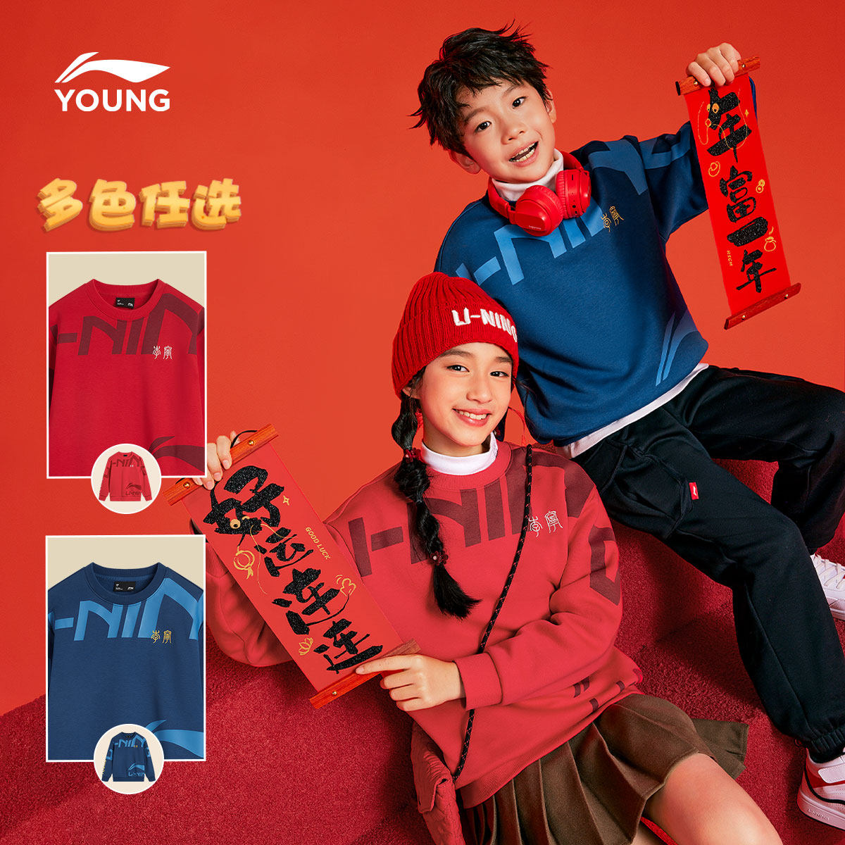 天猫李宁新年加绒卫衣当季蛇年本命年红色衣服男童装女大童保暖套头衫