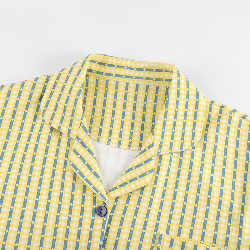 末里末【柠黄格格】2026新款春夏情侣短袖睡衣,以清新柠黄色格纹为基调,融合时尚翻领设计与舒适剪裁,打造兼具颜值与实穿性的居家穿搭。采用100%优质纯棉面料,亲肤透气,吸湿排汗,搭配先进抑菌工艺,有效抑制细菌滋生,呵护敏感肌肤。短袖版型轻盈自在,男女同款设计,轻松穿出情侣默契感。无论是居家休闲、夏日午睡,还是作为度假穿搭,都能带来清爽惬意的穿着体验。柠黄格纹活力亮眼,细节精致走线工整,是2026春夏不可错过的时尚睡衣之选。