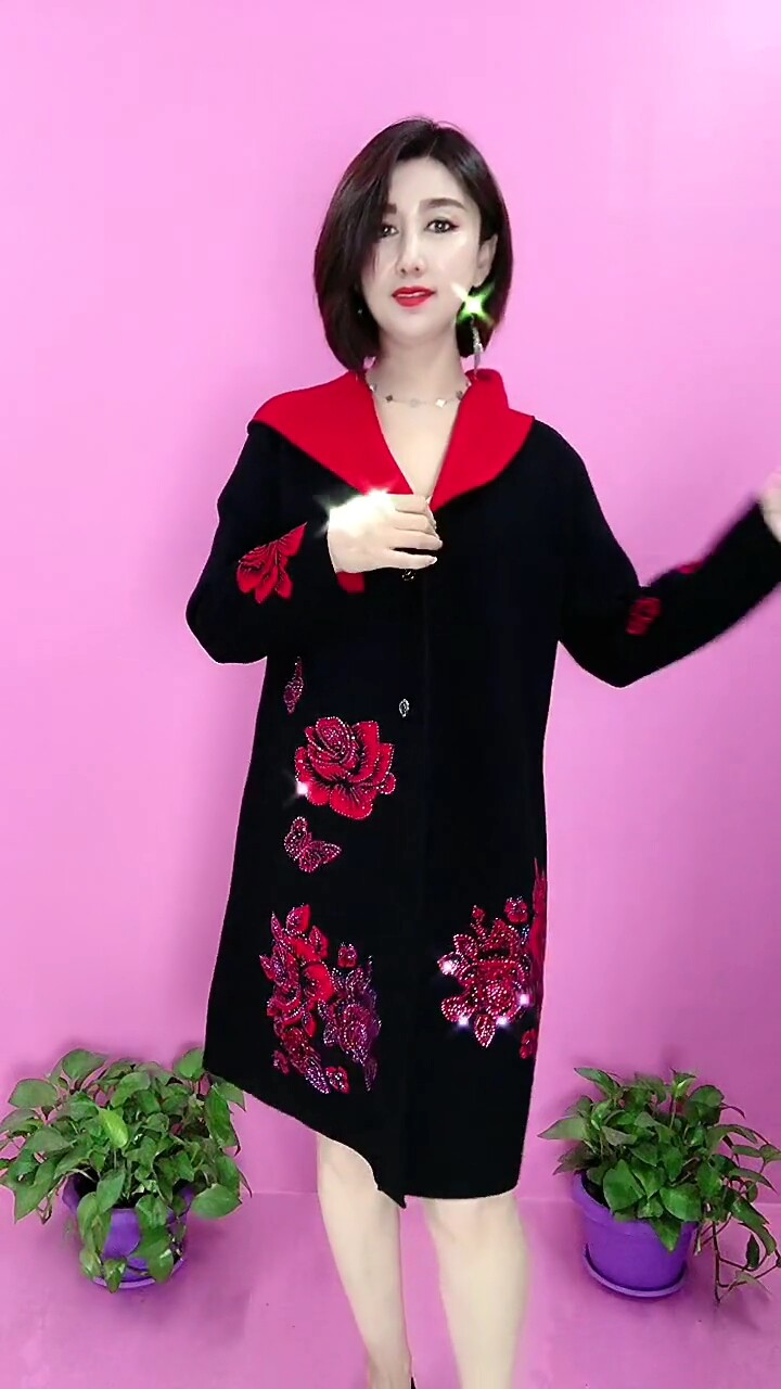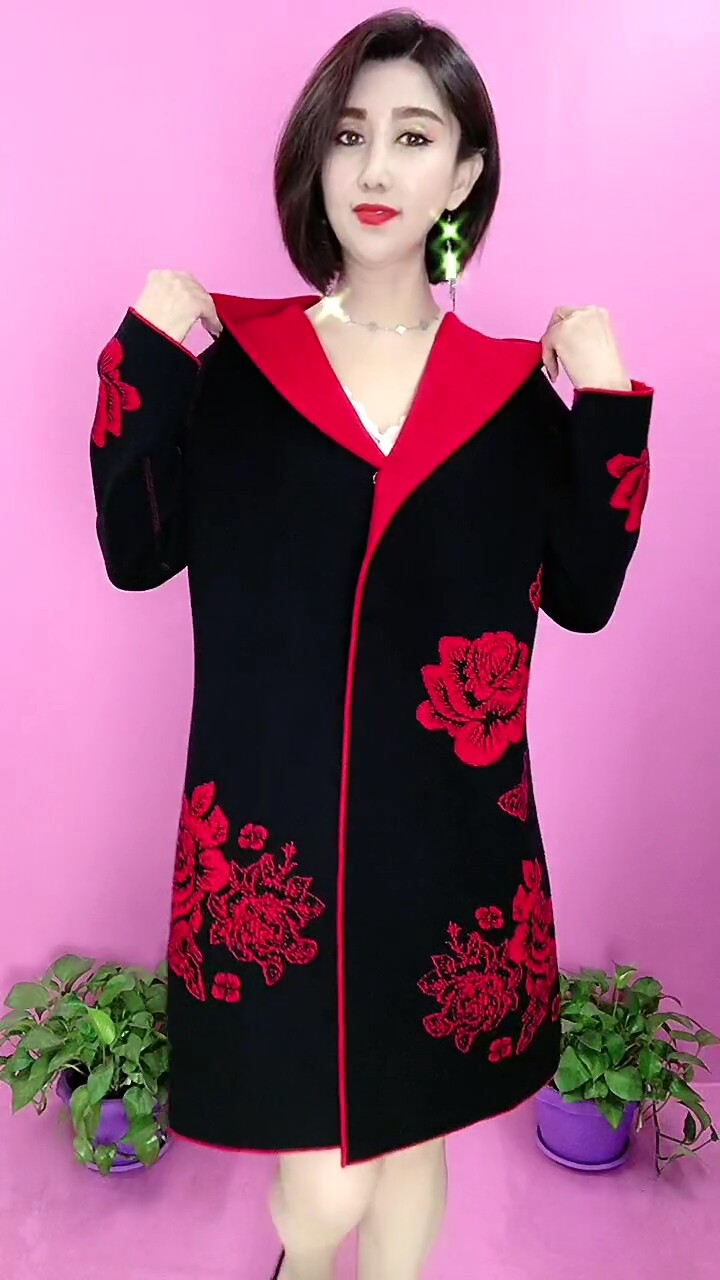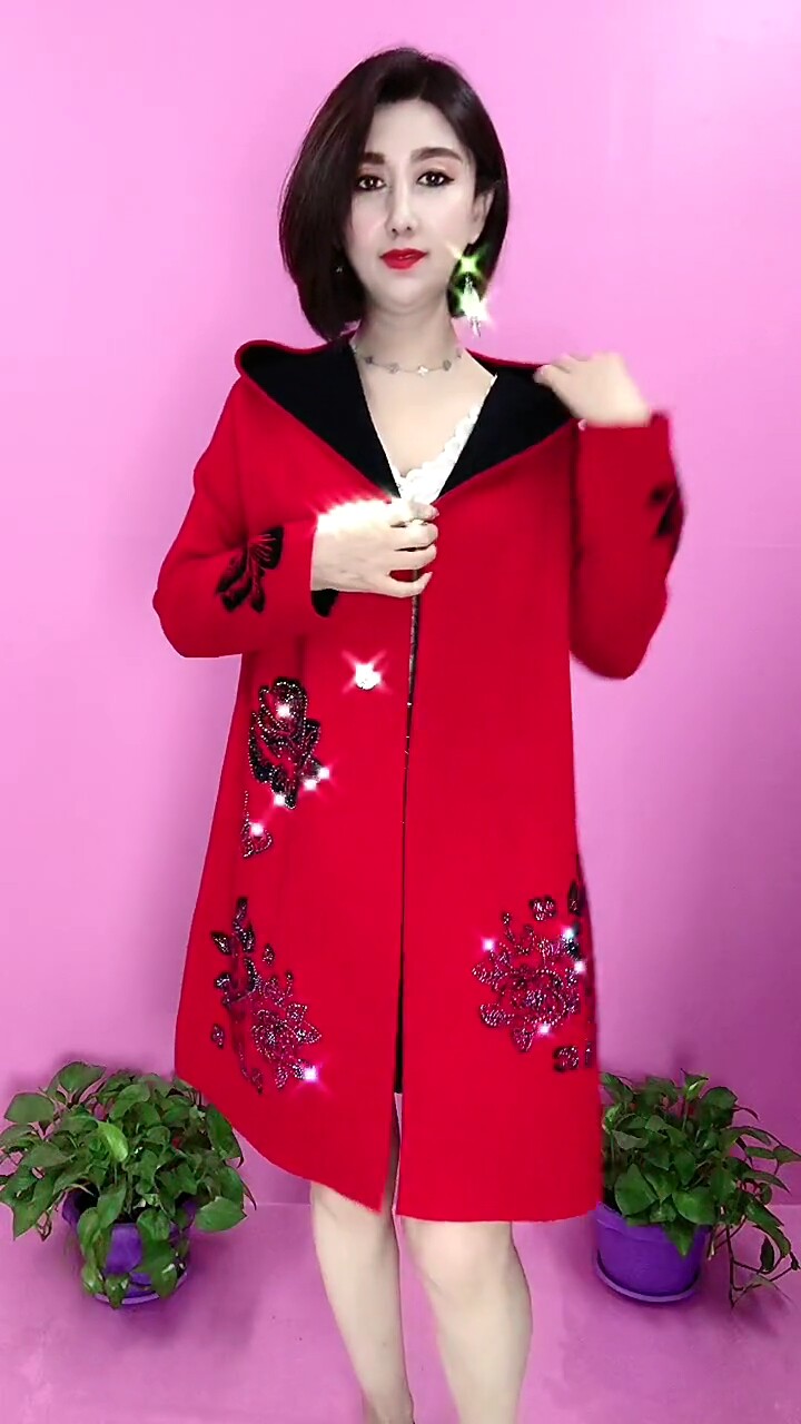 淘宝洋气妈妈两面穿毛呢大衣女中长款连帽红色外套复古高档玫瑰花风衣