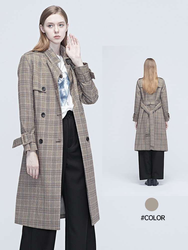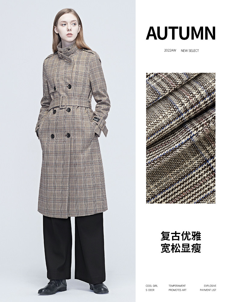 天猫sdeer圣迪奥女装春秋装时尚格纹拼接收腰长款风衣外套S20381820