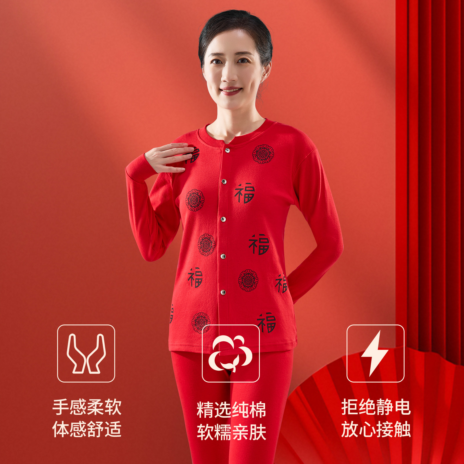 天猫本命年保暖内衣纯棉开衫套装女中老年人大红色秋衣秋裤棉毛衫马年