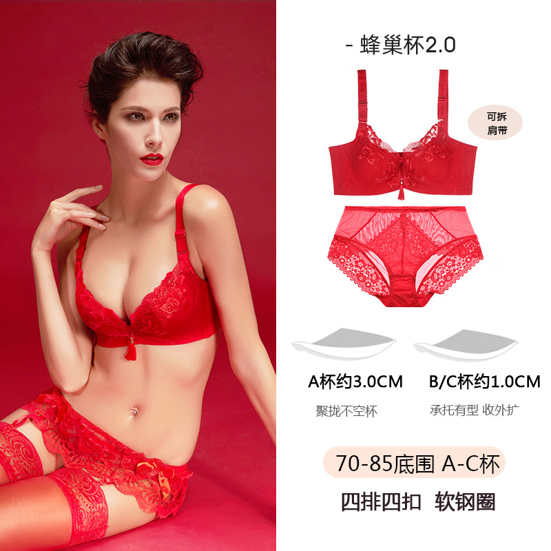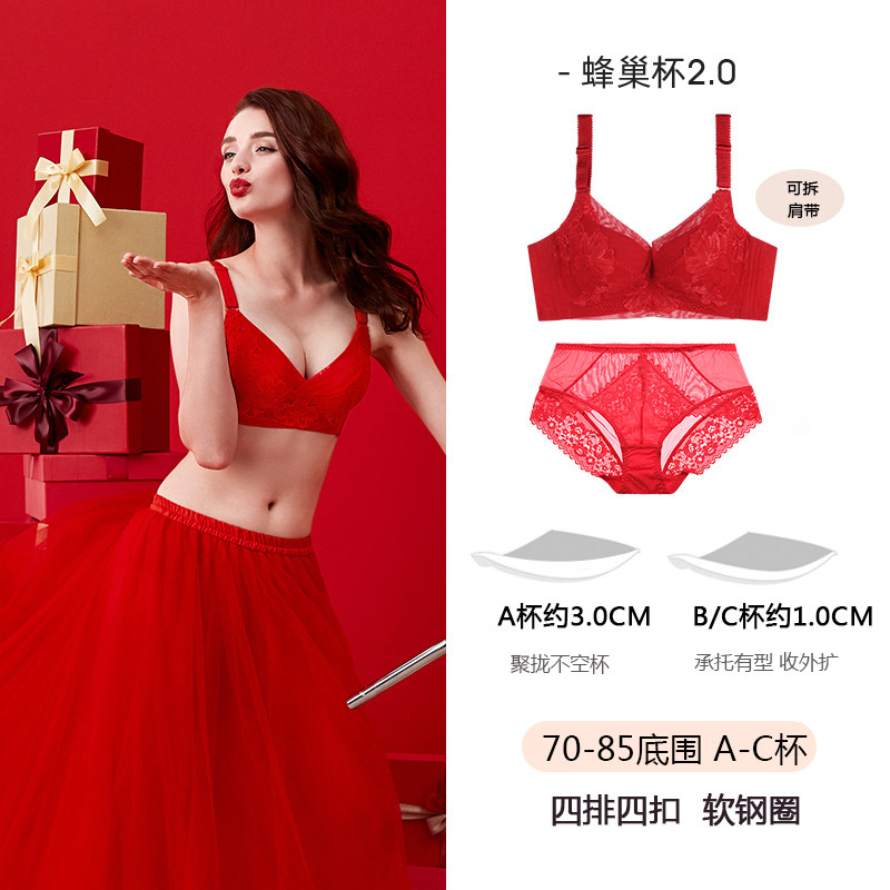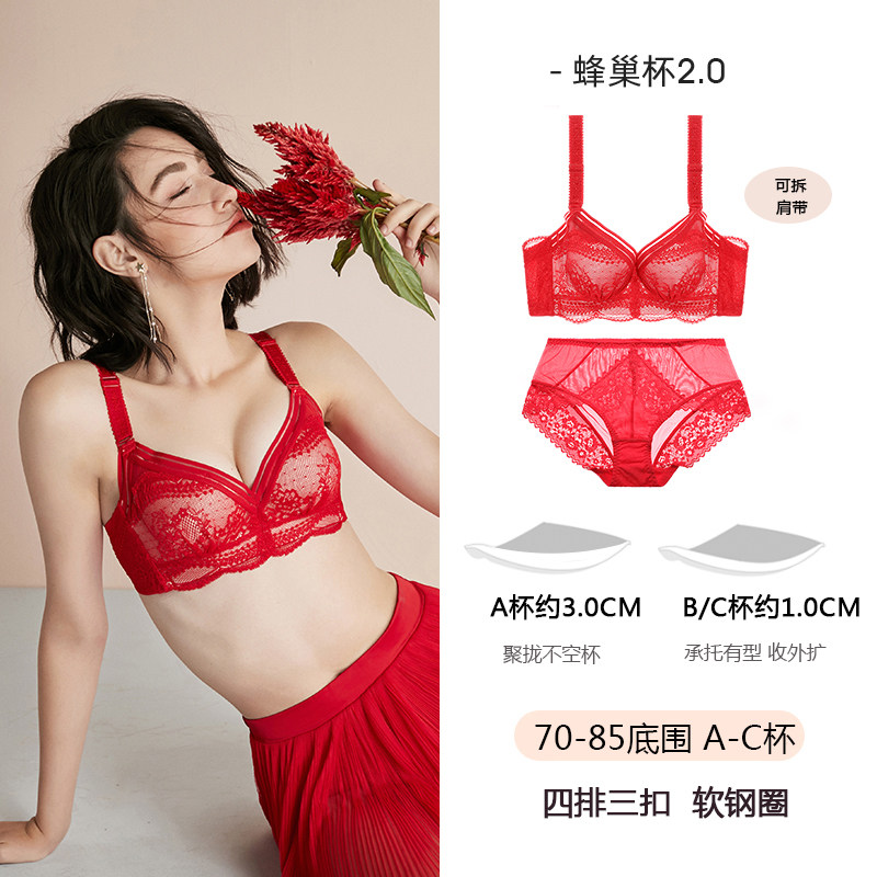 天爱慕婚礼之夜内衣女薄杯性感蕾丝红色本命年大胸显小文胸内裤套装