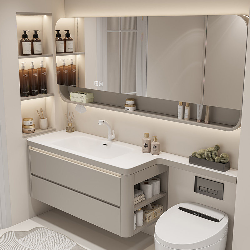 这款高级灰可丽耐一体盆浴室柜组合,融合现代简约美学与实用功能。采用优质实木框架,经多层环保烤漆工艺处理,防潮耐用,质感细腻。台面配备一体成型可丽耐洗脸盆,无缝设计有效防污抑菌,清洁更便捷。搭配加长洗漱台与隐藏式收纳柜,最大化利用空间,满足日常储物需求。整体色调为高级灰,沉稳大气,适配多种装修风格。支持个性化定制尺寸与布局,轻松匹配不同卫浴空间。马桶区域巧妙整合,动线流畅,提升使用舒适度。集美观、环保、实用于一体,是现代高品质卫浴的理想之选。