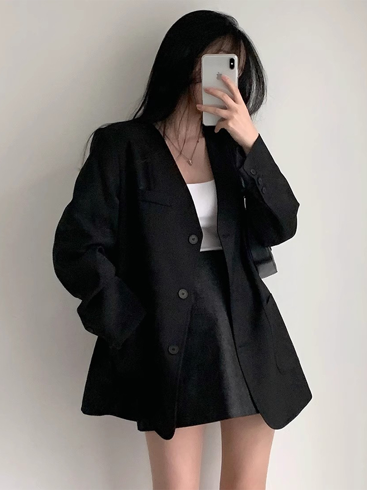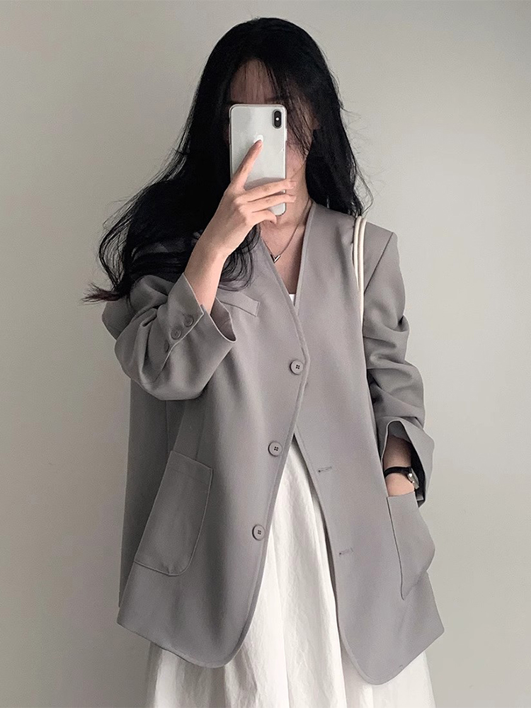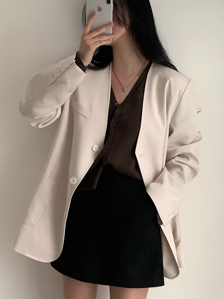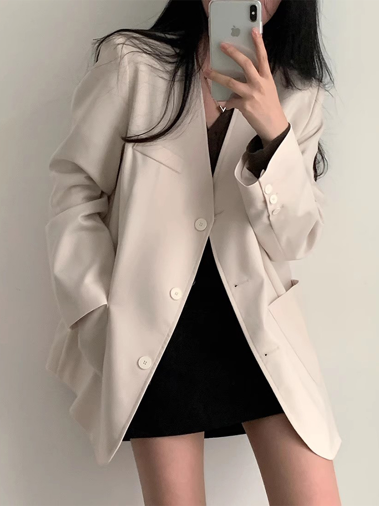 淘宝韩国chic春季新款法式高级V领西装外套女宽松休闲纯色西服上衣