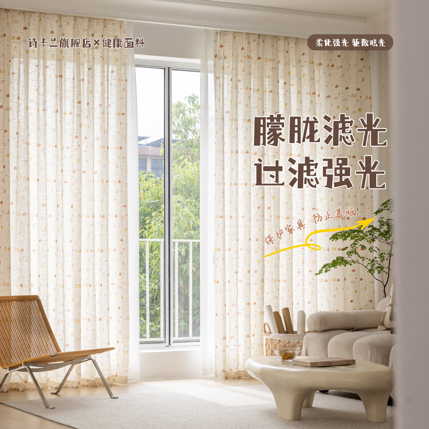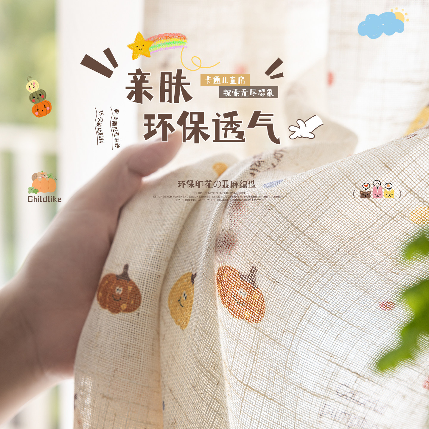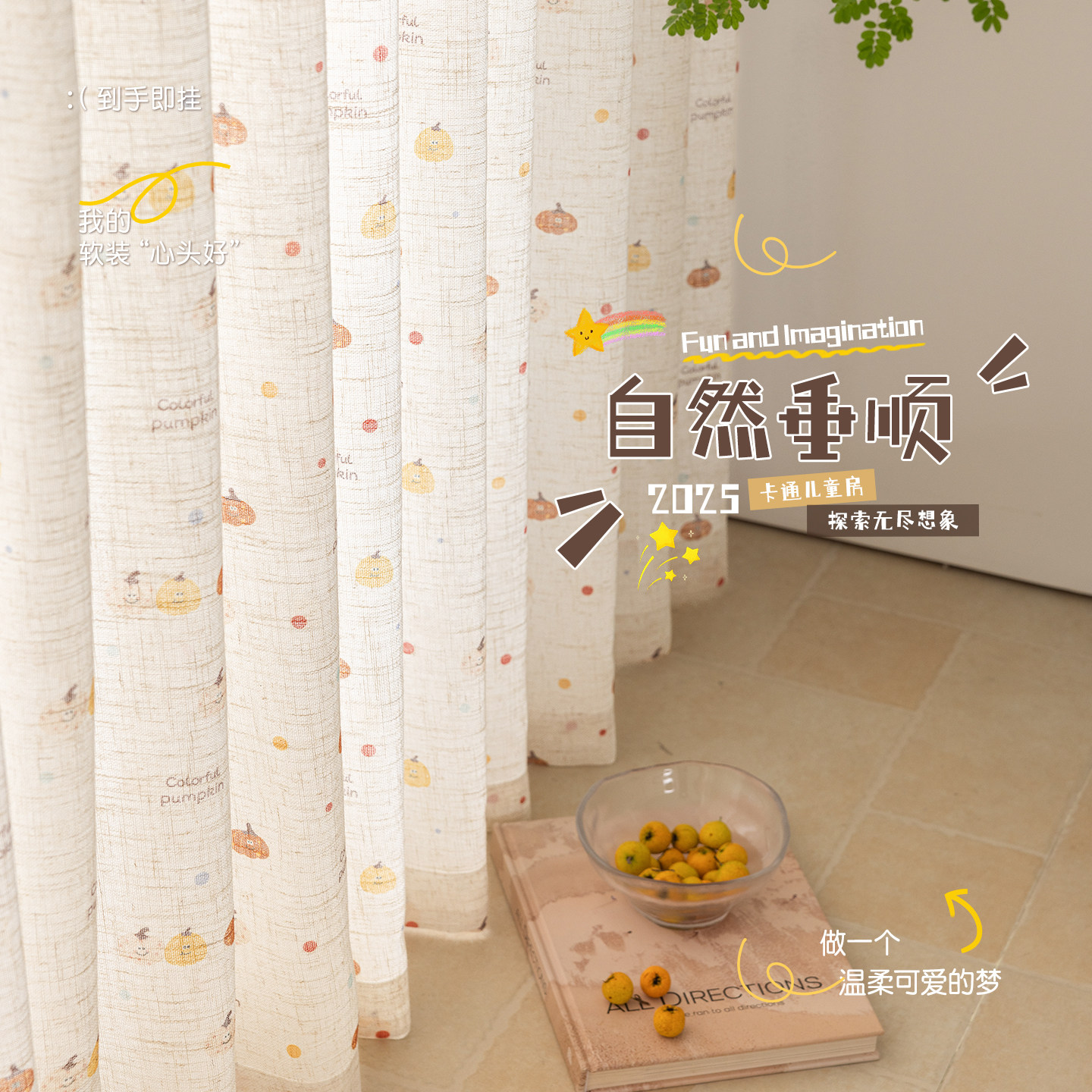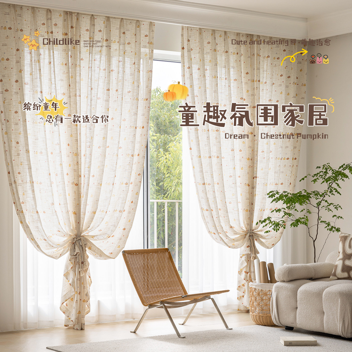 这款新款儿童房亚麻纱窗帘,采用天然亚麻材质,质地轻盈透气,环保亲肤,呵护孩子娇嫩肌肤。独特的南瓜卡通印花设计,色彩柔和温馨,充满童趣,为卧室、阳台或飘窗增添一抹活泼气息。纱帘透光不透人,白天既能引入自然光线,又保护室内隐私,营造明亮舒适的成长空间。细腻的亚麻纹理搭配精致印花,兼具美观与实用,易打理、抗静电,适合各种家居风格。无论是作为主帘搭配遮光布,还是单独使用,都能为孩子打造一个安全、温馨、梦幻的专属天地,是儿童房软装的理想之选。