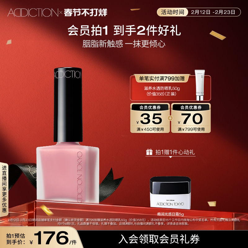 【春节安心购】ADDICTION瘾色液体腮红修容,打造新年纯欲氛围感!轻盈液体质地,一抹即融,贴合肌肤,持久不脱妆。细腻光泽感巧妙提亮暗沉,显白显嫩,轻松塑造立体小脸。自然粉调与修容色巧妙融合,可腮红可修容,一盘多用,省时省力。无论是拜年聚会还是约会聚餐,都能让你气色满分,散发温柔又高级的纯欲魅力。春节焕新颜,安心购好物,ADDICTION助你由内而外绽放光彩,开启元气满满的新一年!