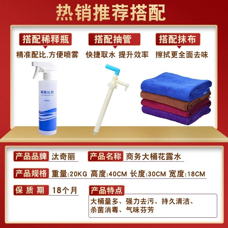 大桶装20kg拖地花露水驱蚊香水,专为酒店、宾馆、饭馆等公共场所设计,夏季使用可有效驱蚊、清新空气。本品采用正品配方,气味清香持久,兼具清洁与除味功能,拖地后地面散发宜人芬芳,营造舒适环境。大容量装经济实用,适合高频使用场所,一瓶可满足大面积清洁需求。安全环保,对地板无腐蚀性,使用便捷,是商用场所提升卫生品质的理想选择。驱蚊成分温和有效,兼顾健康与舒适,让您在炎热夏季远离蚊虫困扰,享受清新洁净的空间体验。
