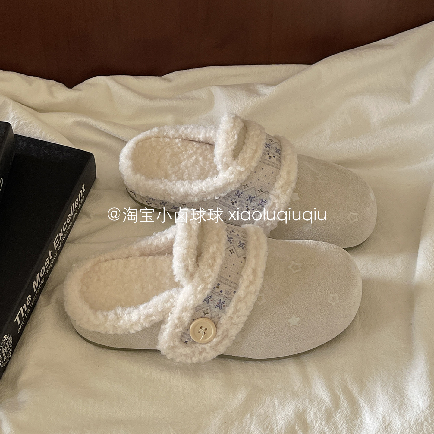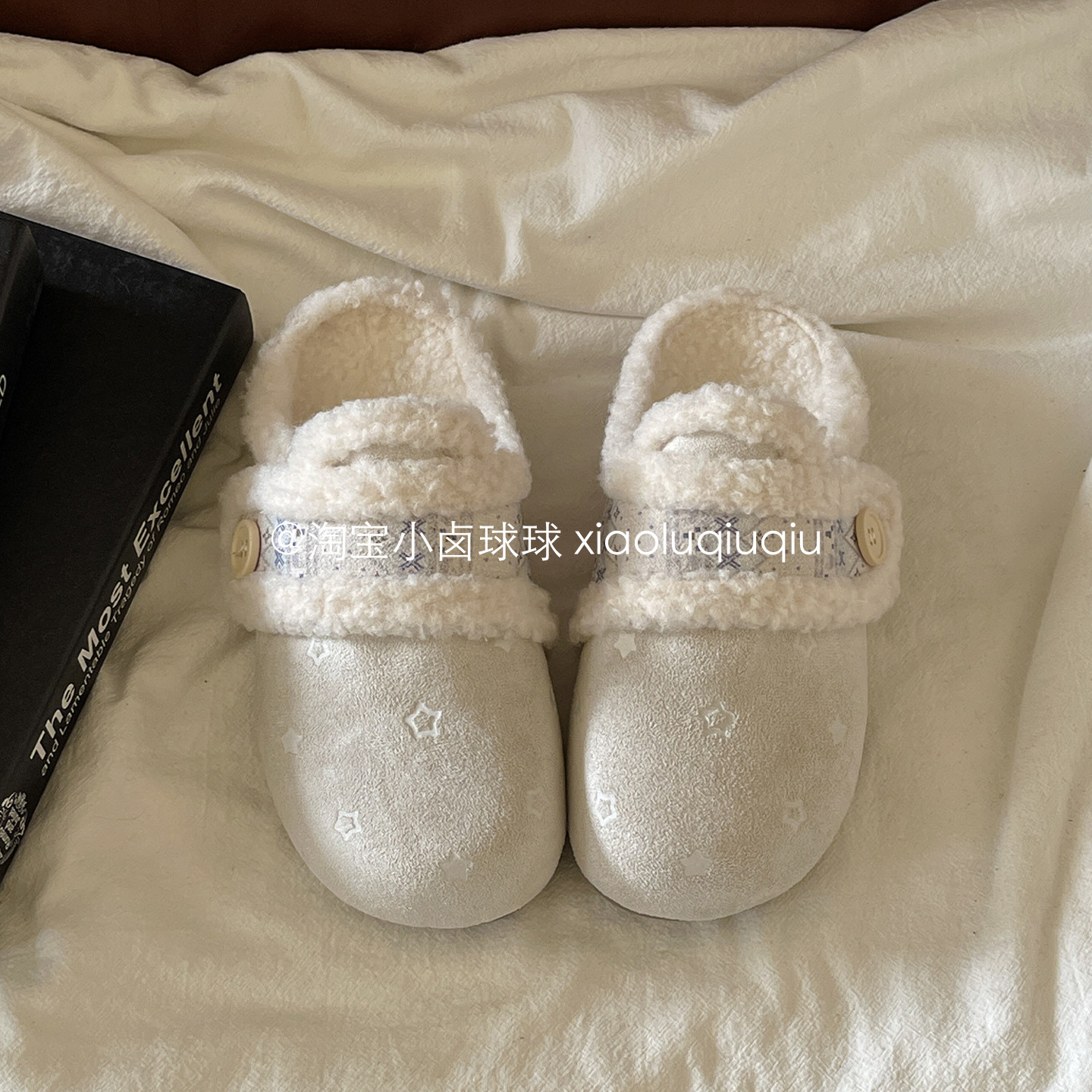 淘厚底加绒勃肯半拖鞋女外穿2025冬季新款保暖毛毛鞋一脚蹬包头棉拖