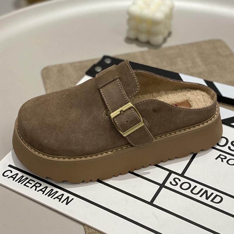 复古真皮厚底大头勃肯拖鞋女外穿磨砂皮增高懒人包头半拖鞋毛毛鞋