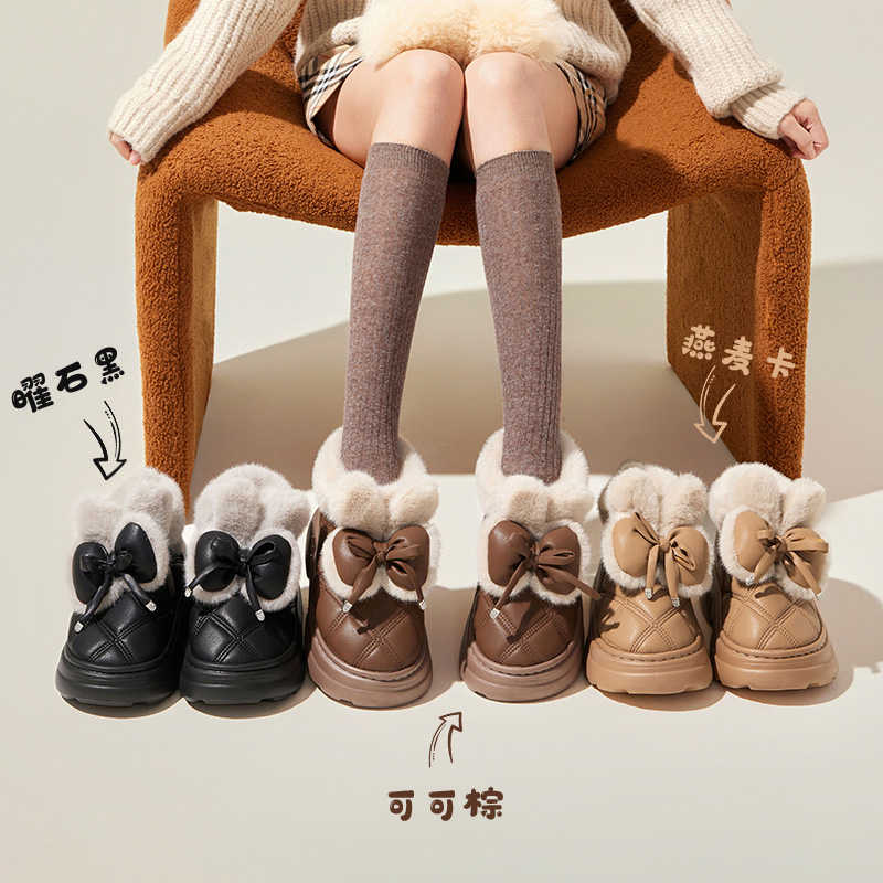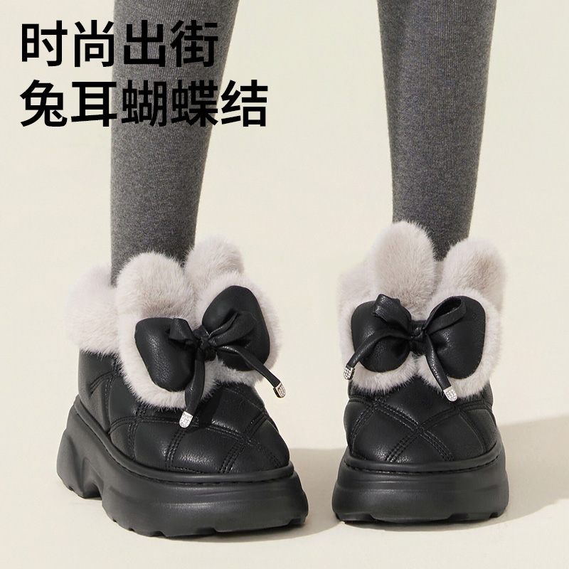 天MINISO名创优品蝴蝶结毛绒拖鞋女冬季室内家居保暖厚底可爱外穿出