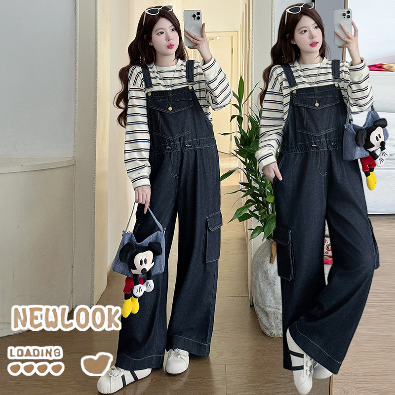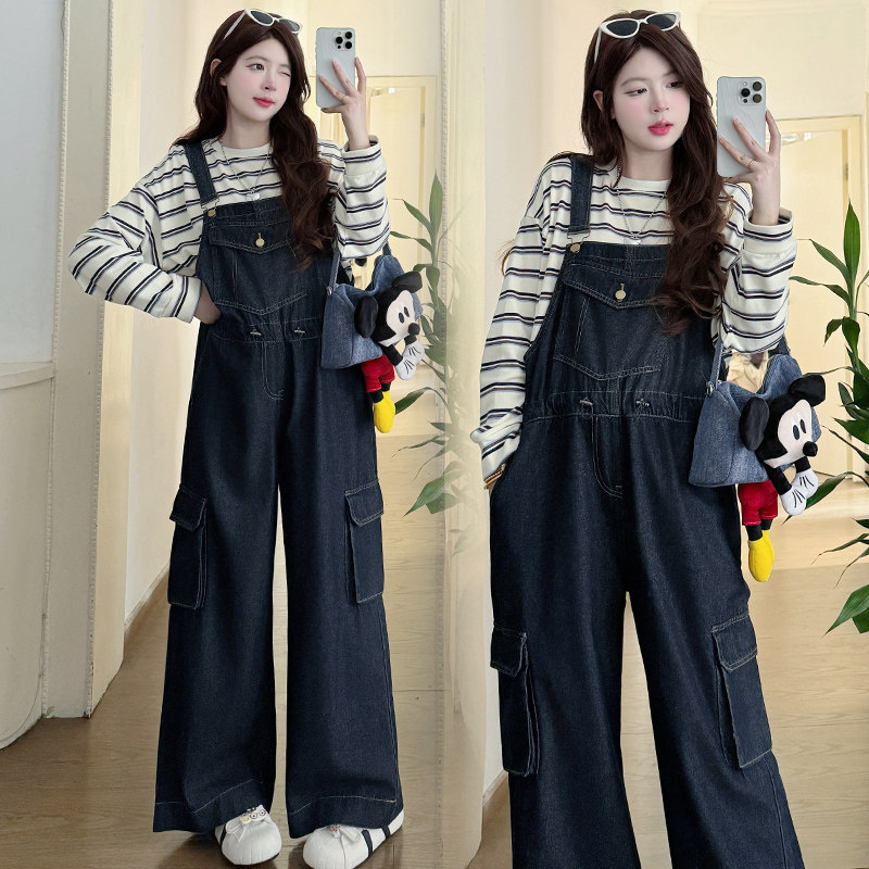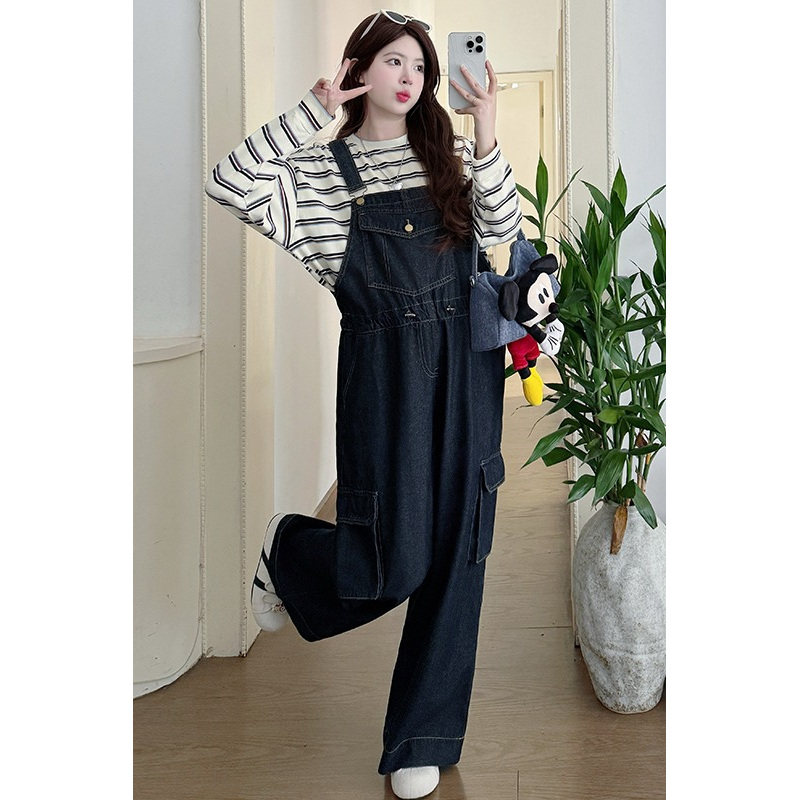 淘宝孕妇套装春秋2026新款宽松韩版牛仔工装背带裤条纹T套装休闲百搭