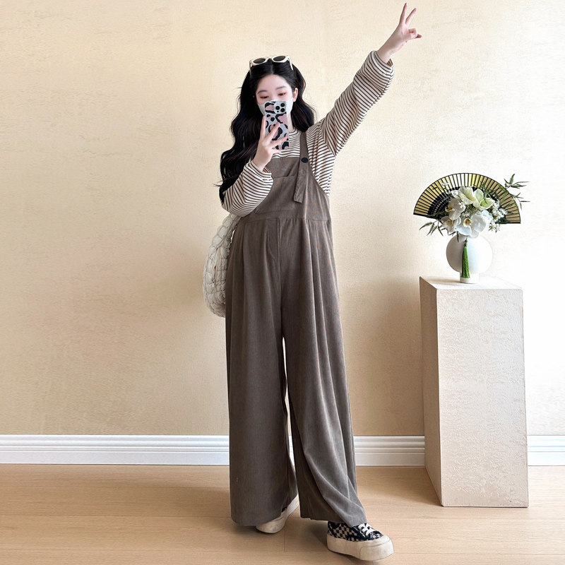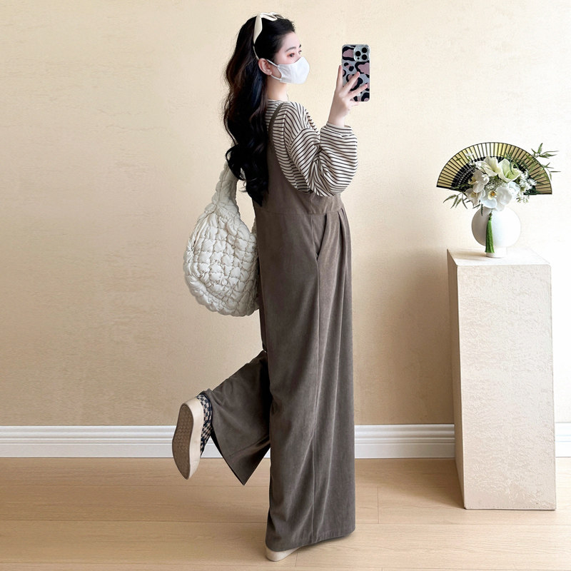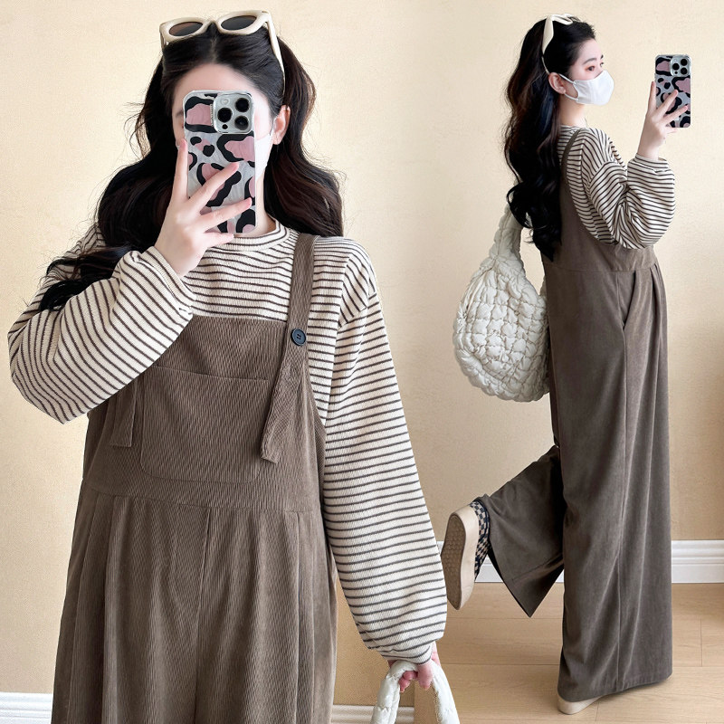 淘宝孕妇套装春秋2026新款韩版休闲灯芯绒背带裤条纹针织T恤两件套女
