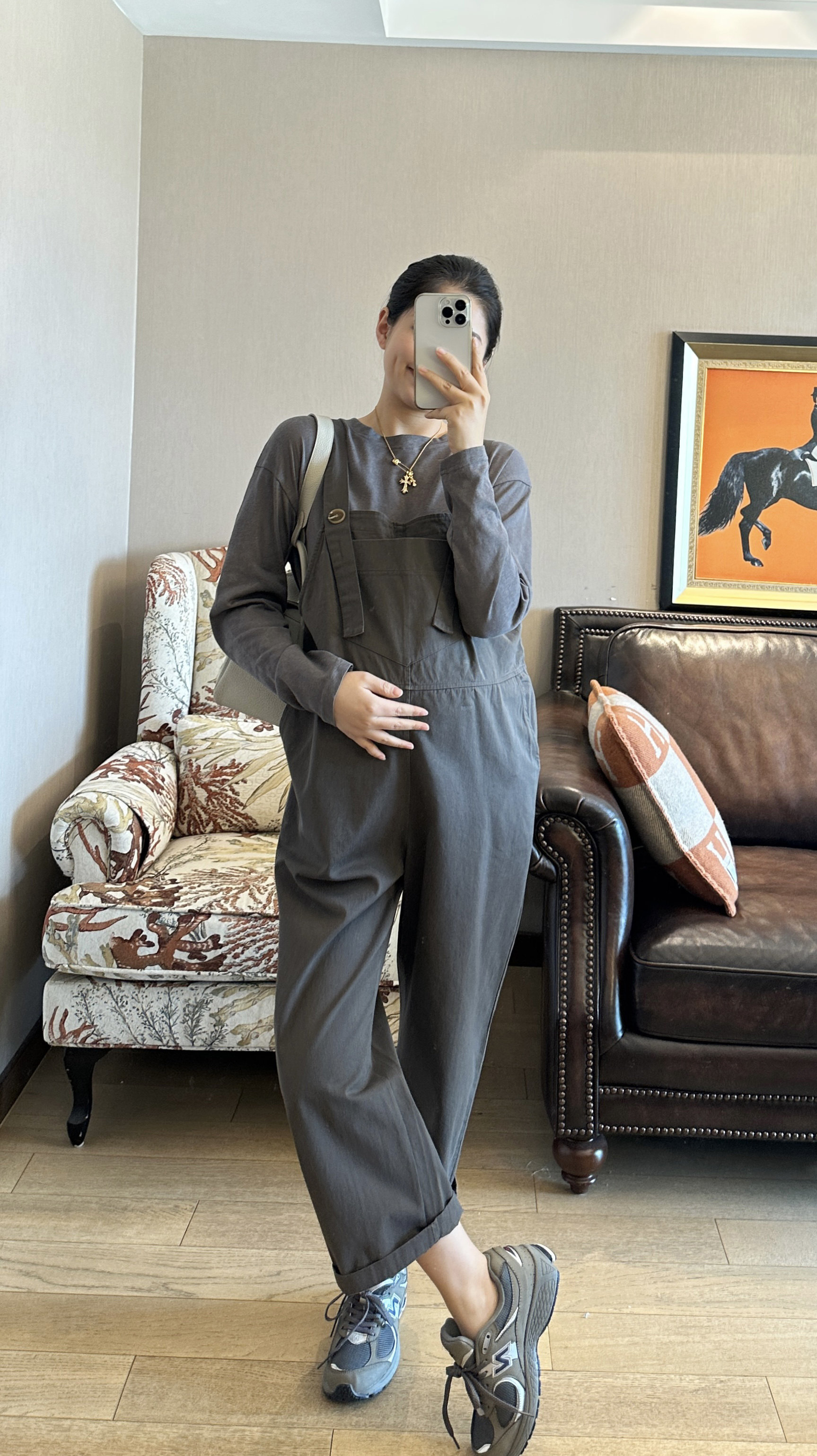 ◆诺初◆孕妇秋装显瘦减齡口袋背带裤复古宽松阔腿裤折边牛仔裤
