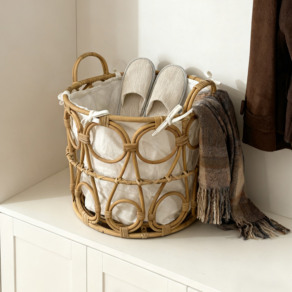这款圆形藤编手提收纳筐,采用天然环保藤条手工编织而成,质地坚韧、纹理自然,兼具美观与实用性。筐身结构稳固,边缘圆润光滑,安全不伤手,搭配舒适提手设计,方便移动和搬运。适用于多种家居场景,可作为客厅杂物收纳篮、浴室洗浴用品整理筐,或用作卧室衣物分类篮、洗衣房脏衣篮,轻松收纳衣物、玩具、毛巾等物品。透气性好,防潮耐用,既保持空间整洁,又增添自然质朴的居家美感。无论是日常收纳还是临时整理,都是提升家居品质的贴心之选。