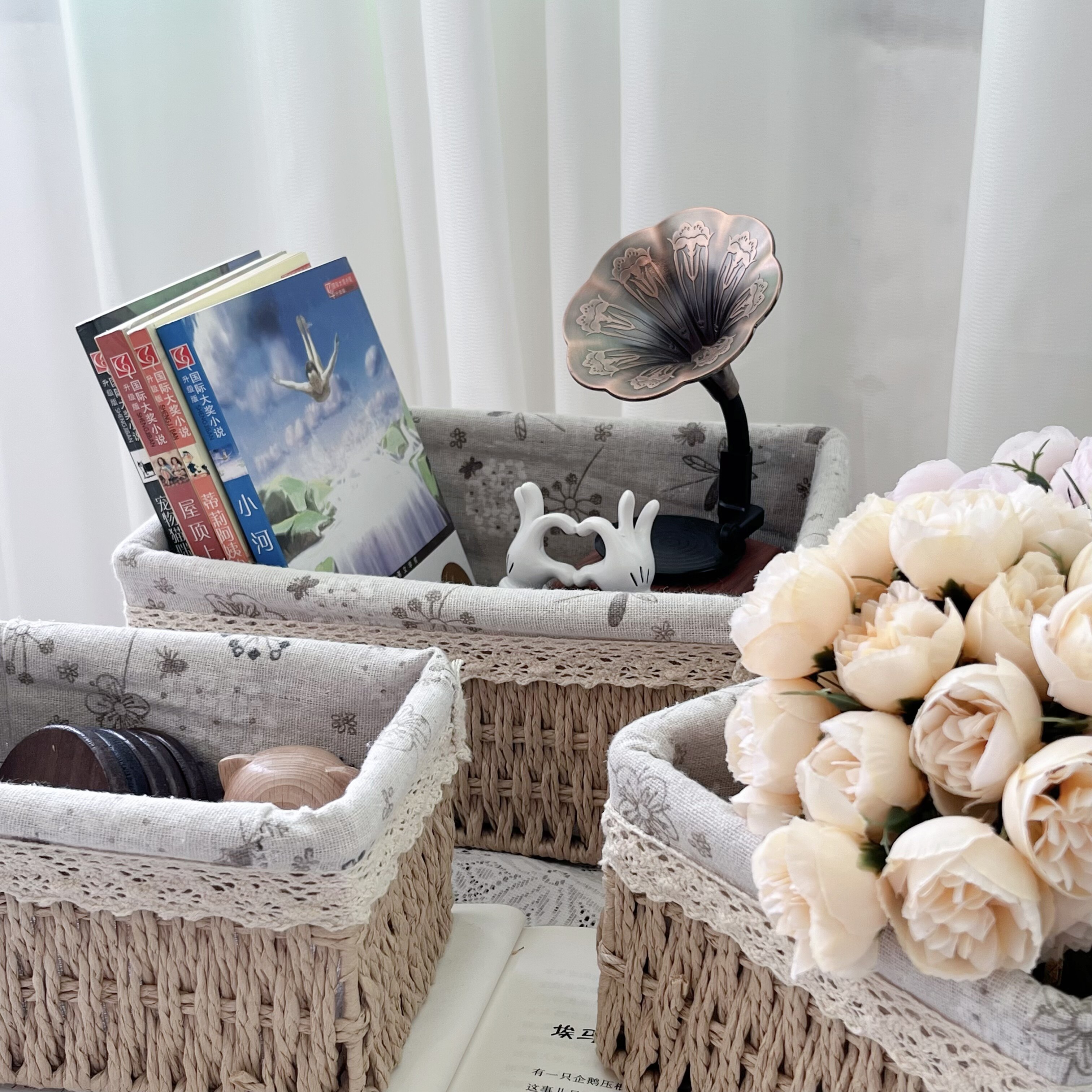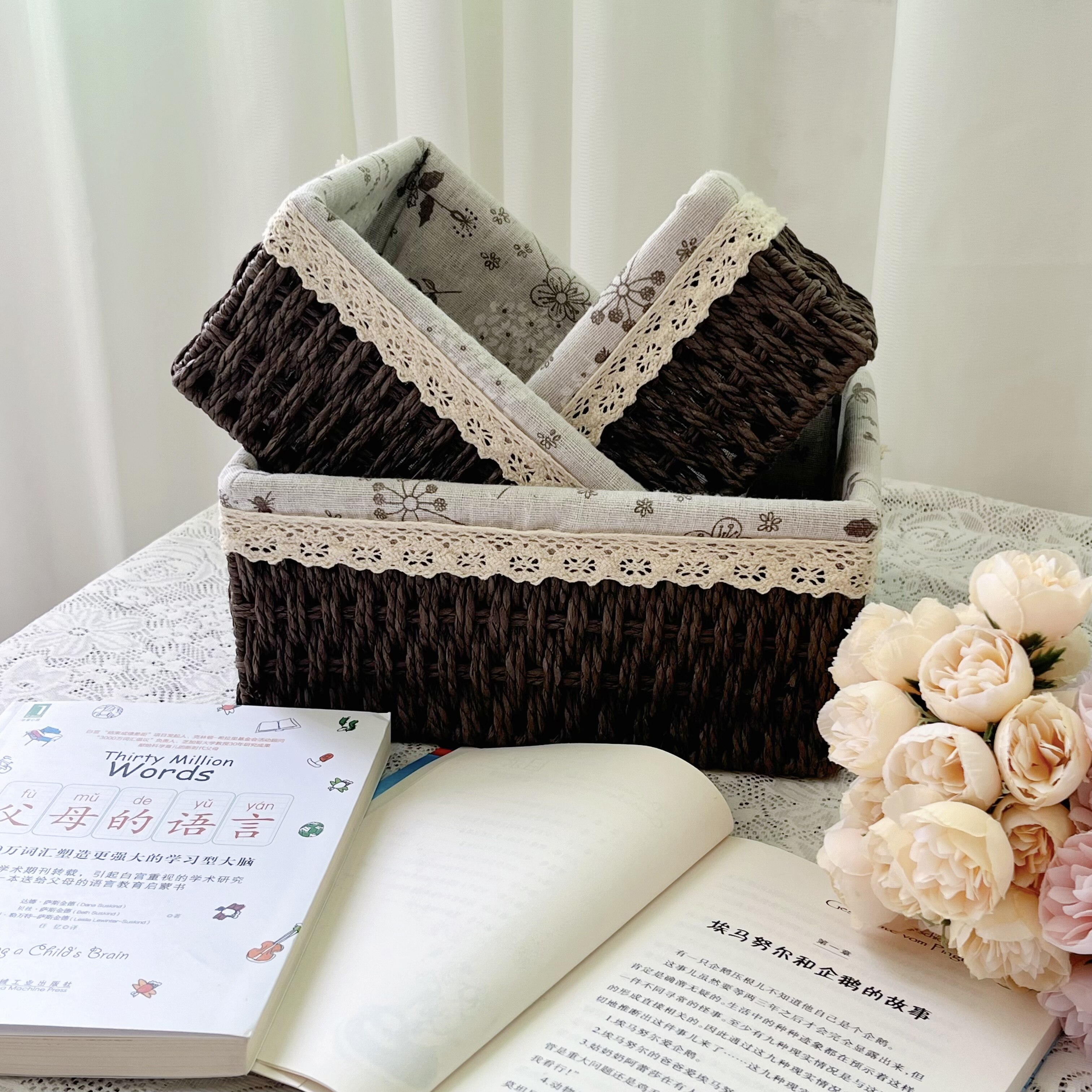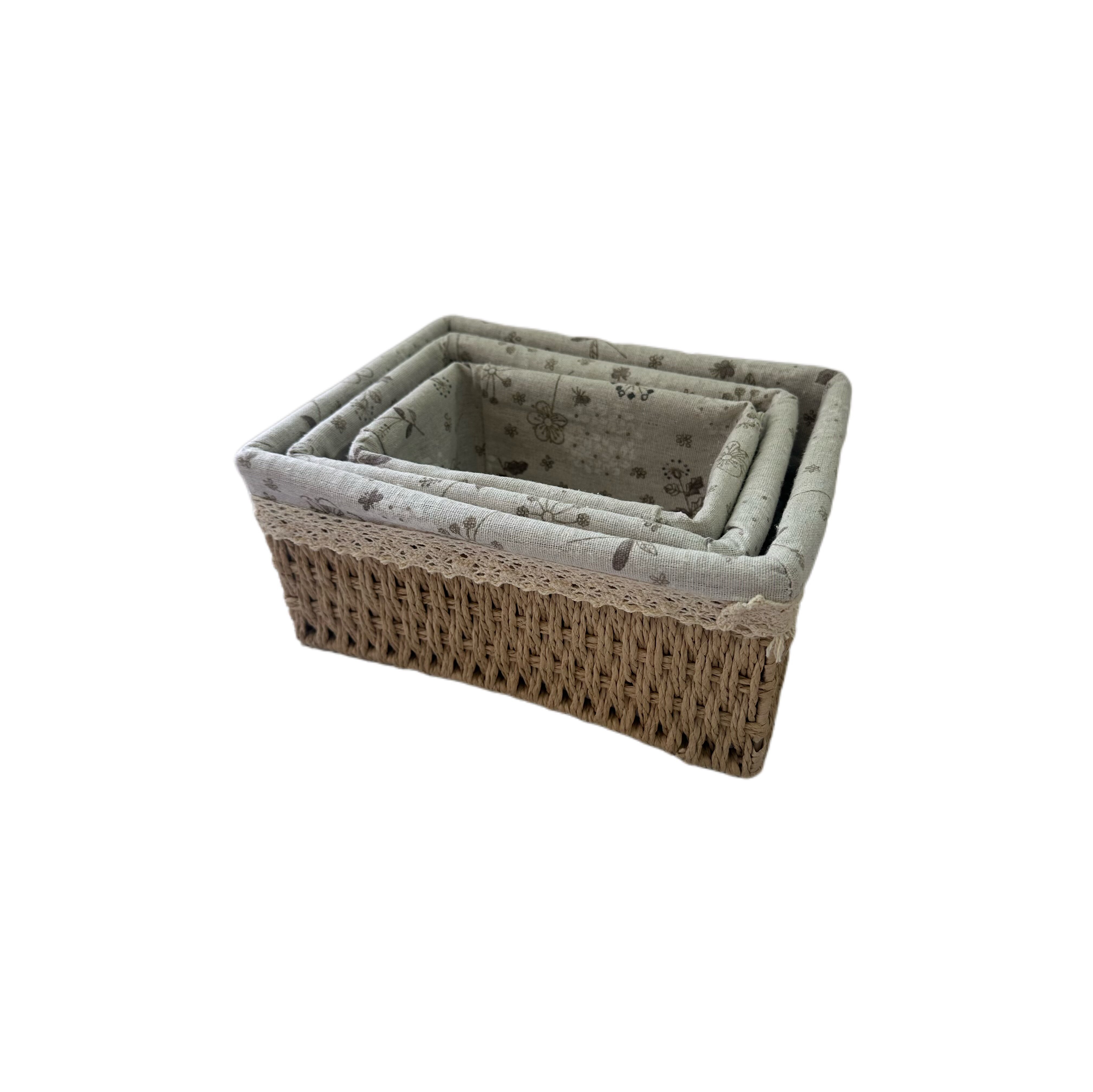 淘宝田园风收纳篮三件套 小中大号浅咖/深咖双色 蕾丝布艺杂物整理篮